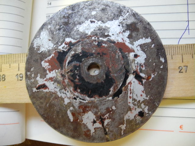 Подскажите,сказали что-то Финское.Диаметр 67мм. толщина 3мм. сталь с белым покрытием.В середина резьба и два винта обломаны.