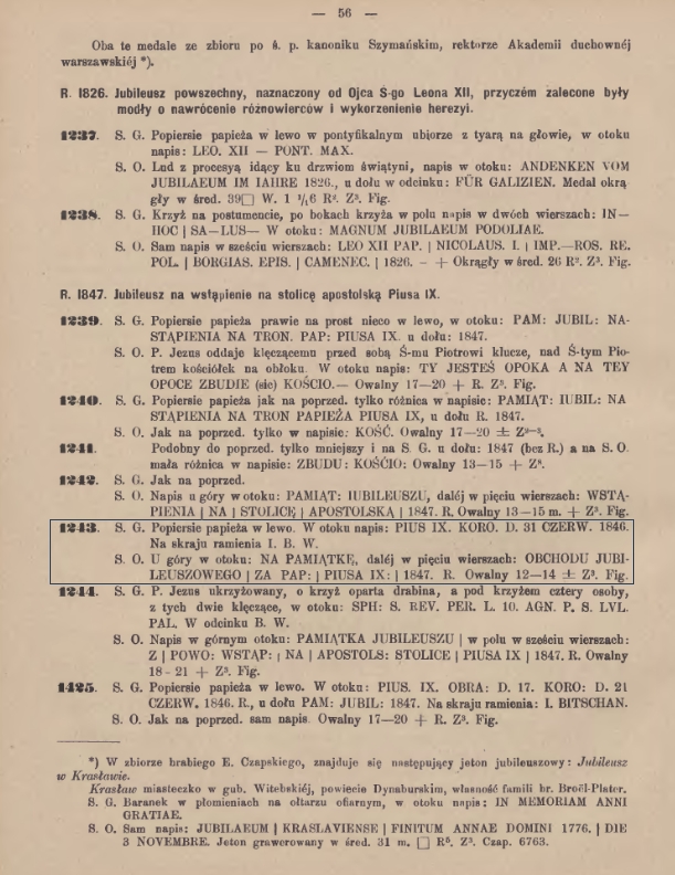 QUOTE(Kudasov @ Oct 23 2015, 13:28) Это польский медальон юбилейного обхода через год после вступления на Святой Престол Папы Римского ПИЯ IX. (извини, немного криво перевёл) Вот примерное описание: Хотя это не совсем то. Про обход не написано. Фотки бы по-чётче. Может просто медальон годовщины со дня вступления на престол. И как он сюда попал? Спасибо за помощь в определении. Очень похоже, лицевая сторона один в один, как в описании, а обратка немного отличается, больше похожа на следующий номер в этом каталоге. Может, мастер чего начудил со штемпелями? |