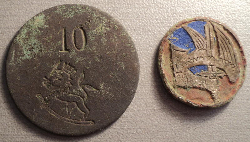 Разбирал шмурдяк с прошлой осени,отмыл две непонятки.Может у кого есть подсказка что за жетон и часть финского знака?Кружок с цифрой 10 размером с 5р ходячки.За любую инфу заранее спасибо.