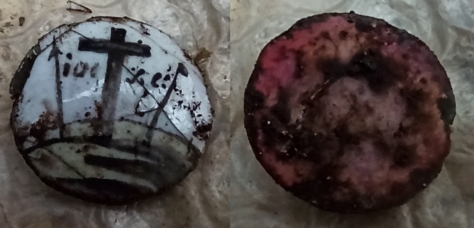 QUOTE(B.Wooster @ Nov 23 2020, 18:06) ... Еще попался странный предмет - размер 2 см, тонкий металл, покрытый эмалью, слегка выпуклый. От чего это могло отломаться? От ладанки. По разному их "компоновали", были двусторонние, были в виде закрывающегося створочного медальона, на подвесе. Голгофский крест с орудиями страстей Христовых. Открытие по снежку вполне себе позитивное ;-) |