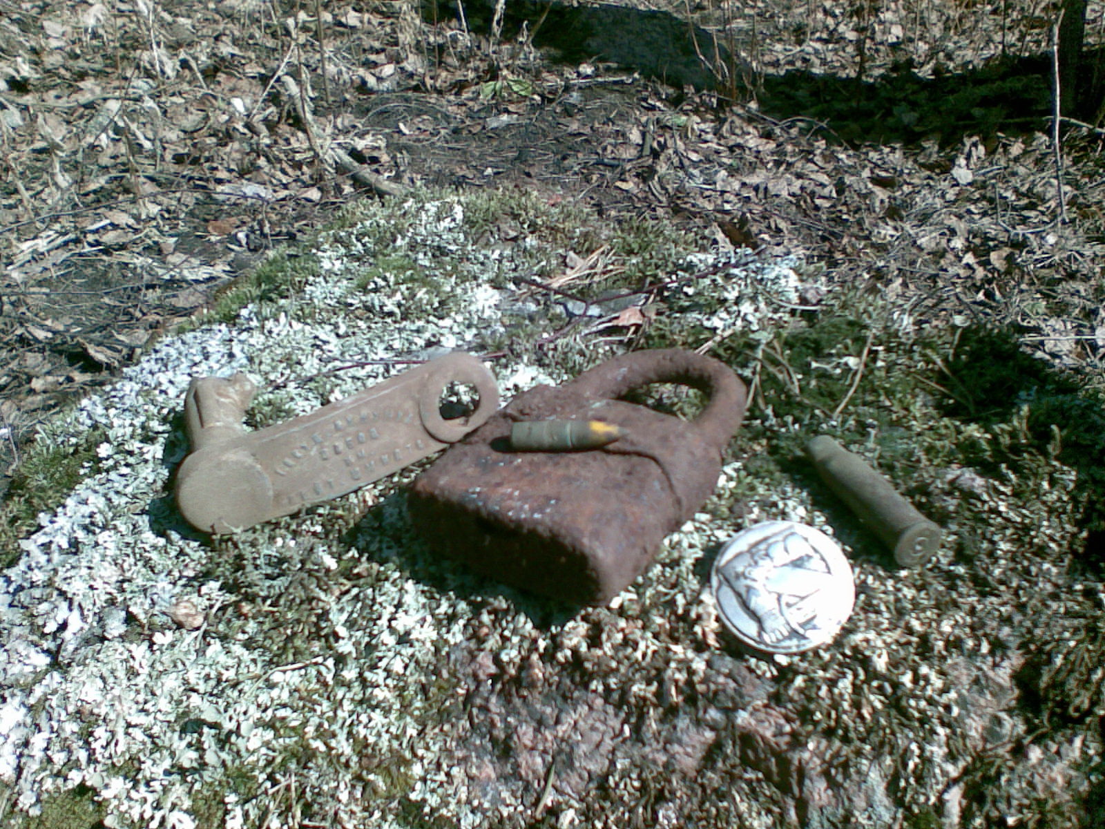 Вот все что было, не считая г... всякого. Одна пуля, одна гильза. А знак нашел под деревцом, глубина см 25-30. Сигнал 46 (т-74) ну и собственно все. Шел к фундаменту и вот на выходе из леса поймал, подолбить пришлось , но не зря. Благо еще лопатой не садонул по знаку. Клему аккумул. нашел, прикольная, "Госуд. аккумул. завод им лейт. шмитдта на ней выбито. "