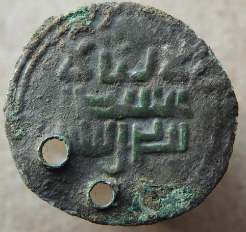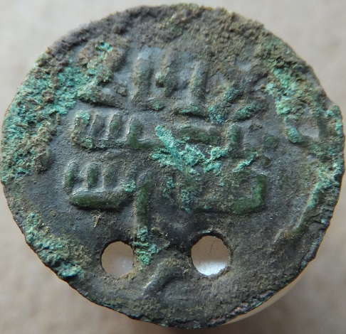 Мое мнение: изначально подражание куфическому дирхему, чеканенное из меди с покрытием, которое не сохранилось, или из низкопробного сплава, затем оно было обрезано по кругу, после чего пробито и использовалось как привеска.