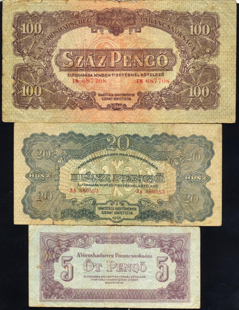 50 пенго 1932 г.- 80 р. 10 пенго 1936 г - 90 р. 5 пенго 1939 г.- 90 р. 1 млрд. пенго 1946 г.- 130 р. 5 пенго 1944 г.- 120 р. 20 пенго 1944 г.-120 р. 100 пенго 1944 г. -120 р. |