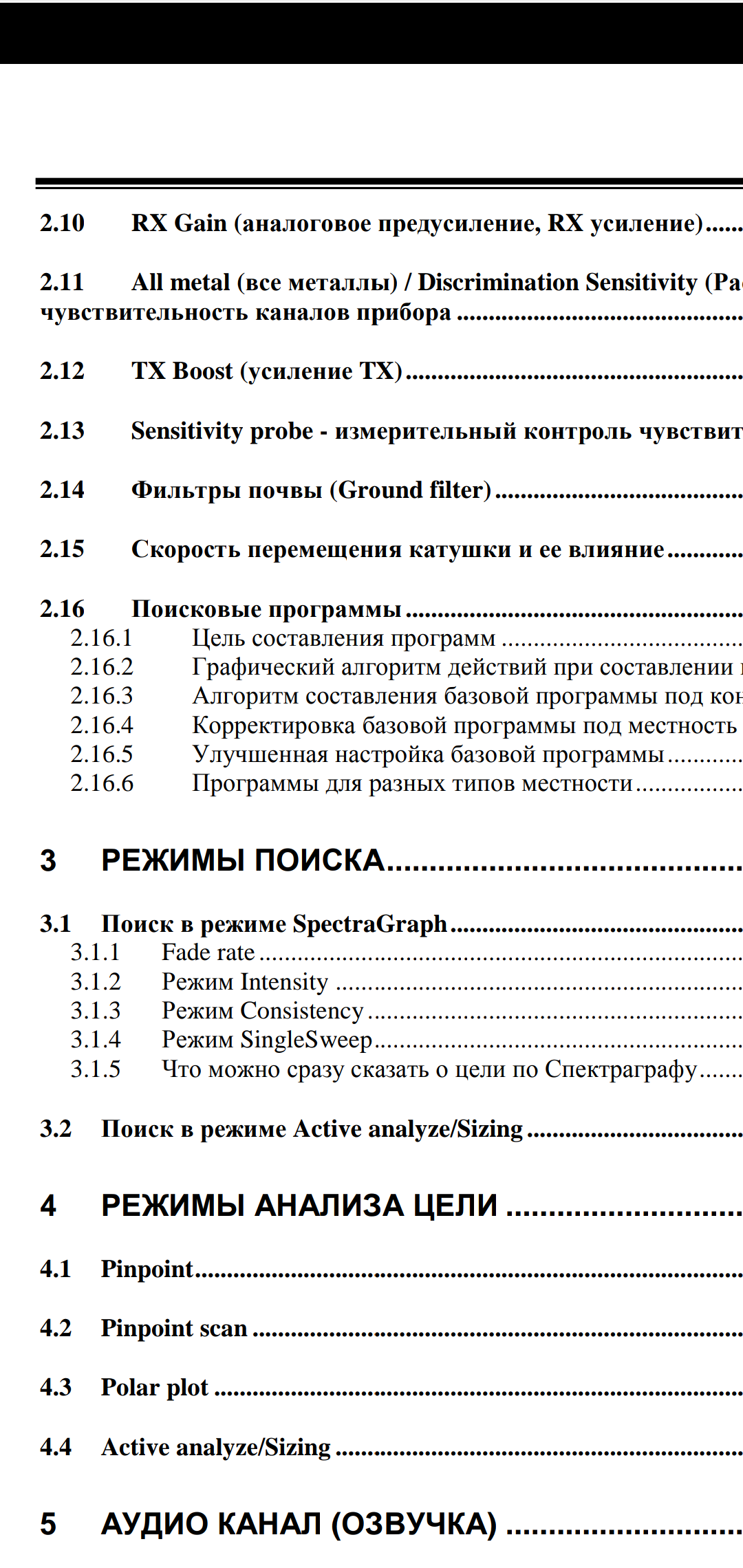 QUOTE(gruumsh @ Apr 27 2023, 14:03) Вот про функцию пробы грунта из инструкции. Зачем тогда балланс грунта (который для того нам и дан, что бы извлечь из системы отклик от грунта), две одинаковые функции, сомнительно? Русскоязычную версию как работать с пробой грунта я вам оттуда и привел (из 500х страниц, там выжимка от опытных пользователей делалась). По этим данным можно более точно выставить границу и направление при использовании функции "отслеживание грунта". Функцию "отслеживания" вы можете включить после выполнения БГ. То есть в этой программе вы получаете данные для настройки "отслеживания", а не самого Баланса Грунта. Прибор хороший. Но для новичка слишком сложен. -------------------- Сегодня ты никому не нужен , а вот завтра .. тоже.