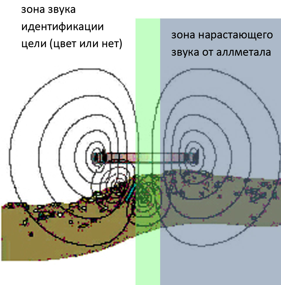 QUOTE(MaximM @ May 3 2023, 09:01) Доброе утро! Безусловно, этот совет я учту. Хотя, повторюсь, в металлопоиске - как в хирургии - "сомневаешься - режь!" (копай!). Если будет время, немного о "черных, мягких сигналах". И, если это не секрет, какую программу используете при поиске и её основные настройки, какие параметры в режиме "анализ"? Заранее благодарен, с уважением. На приборах где есть 2а звуковых канала (аллметал и дискрим на спектре и РВ и КТ на сигнуме) очерненную цветную цель можно вычислить по их соотношению (громкости и размеру) показателей. Картинка 1 Звук по каналу дискрим-когда цель УСЛОВНО проходит центр катушки прибор выдает нам информацию о цвет\не цвет. Звук по каналу алл металл-он начинается задолго до пересечения с центром катушки. И даже в зоне бокового захвата катушки, если цель большая (имеет большое поле) и находится относительно не глубоко. Картинка 2. Алл металл дает понятие и о размере цели и о ее глубине. Чем размер зоны алл метала больше, тем цель крупнее и лежит выше. Представить это можно, как длину пересечения зоны принятия от датчика (условная сфера) и условную сферу отклика от цели. Нет это не ровные сферы, но принцип должен быть понятен. Общий вывод. Большой ревущий аллметалл с черно-цветным сигналом по дискриму-это скорее всего железо не глубоко. А черный сигнал по дискриму, но с малой зоной алл метала (без зеркого рвущего центра) с низким уровнем силы сигнала (это когда прибор показывает глубину 25...30 см и больше). То это может быть очень глубокий цвет. +очень сильно заглубив поднос, можно получить размер зоны отработки канала алл металл, как и у монеты. Картинка 3+ Дальше надо смотреть какие частоты какие показания дают и тд. Но общий смысл я раскрыл, что очень глубокие цели можно тянуть только на стерео моде или миксмоде или с пороговым тоном (он вроде так же работает как и алл метал канал). Надеюсь не запутал и стало понятнее-копаю сигналы с небольшим слабым (тут чисто опыт полетов) откликом по алл металлу. Особенно в секторах закида в - меди, это -95 и около того. Так же и с черными сигналами, близкими к 0. Это -20 и -10, туда может уходить рыже. ---------------------- Хожу в микс моде. Без дискрима. В основном на 3х частотах. Балланс грунта фиксированный, тоесть качаем. Чуйка от 8 до 11 (зависит от размера катушки и условий поиска). Если буст, то чуйку вниз убираю. Дискрим и алл металл около 90 (если хожу со снайперкой, то алл метал снижаю к 60, до уровня фона иначе устанешь). Фильтр, почти всегда 5 Скорости востановления-зависит от размера датчика в районе 30и. Да ничего такого нового и секретного в спектре не так много чего покрутить можно, что бы каждый раз крутить. Вложенные эскизы изображений |