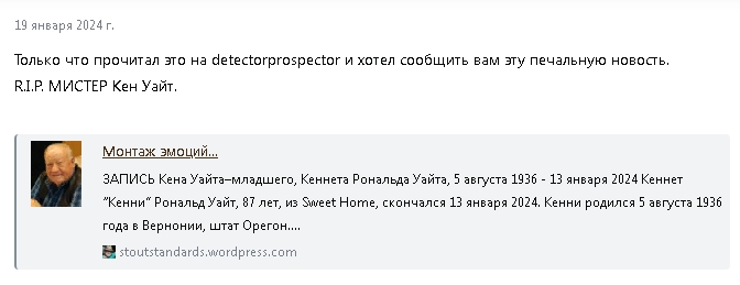 QUOTE(Dmitrij L @ Mar 13 2024, 12:45) Добрый день пользователям и мастерам! Не могли бы вы дать рекомендации по самостоятельной профилактике прибора Whites s v3i от описанных выше проблем, деформации платы, и тп. И в целом, как продлить жизнь детектора? Выше в теме упоминалось о катушках от пользователя Диэлектрик. Есть ли возможность приобрести их с доставкой в Европу? Спасибо. Всех с открытием сезона! https://www.reviewdetector.ru/index.php?showtopic=571432 -------------------- - И Мороз Красный нос нам подарки принес: