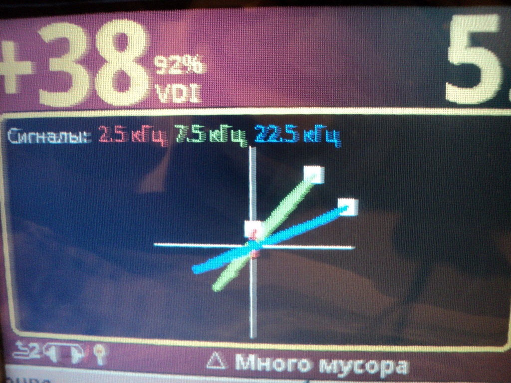 Цель: ![]() Чешуя. Скриншот в режиме Corellate: ![]() Скриншот в режиме Best Data: ![]() Схема: ![]() Из схемы видно, что даже после нормализации VDI цель дает сильный разброс: +8,+38 т +42. С таким разбросом режим Corellate будет часто вообще цель пропускать или придется ставить span=15-20, что вообще сводит на нет все прелести Corellate. В Corellate VDI будет (38+42)/2=40 (на экране получилось 39, я где-то ошибся в измерении углов) Зато режим Best Data выберет частоту 22.5 кГц, т.к. отклик самый сильный и VDI будет +42. Однако самый интерес не в этом. Канал дискриминации работает ПОСЛЕ Corellate и Best Data, т.е. он работает с результирующим VDI, а если Corellate решит, что разброс великоват (и confidence <50%) - ВЫ ЦЕЛЬ ПРОСТО НЕ УСЛЫШИТЕ. На экране она будет, да, но маловероятно, что вы все время будете на экран смотреть. Так и упасть недолго... Чешуя вообще в процессе исследования показала интересные свойства. Самое главное - грязные сплавы. Это дает такой разброс VDI (как на картинках). Самый чистый - петровские копейки, но их вроде из талеров изготавливали. Серебро было хорошее. У петровской копейки фазы чистенькие и разброс небольшой, как у рублей серебряных. |