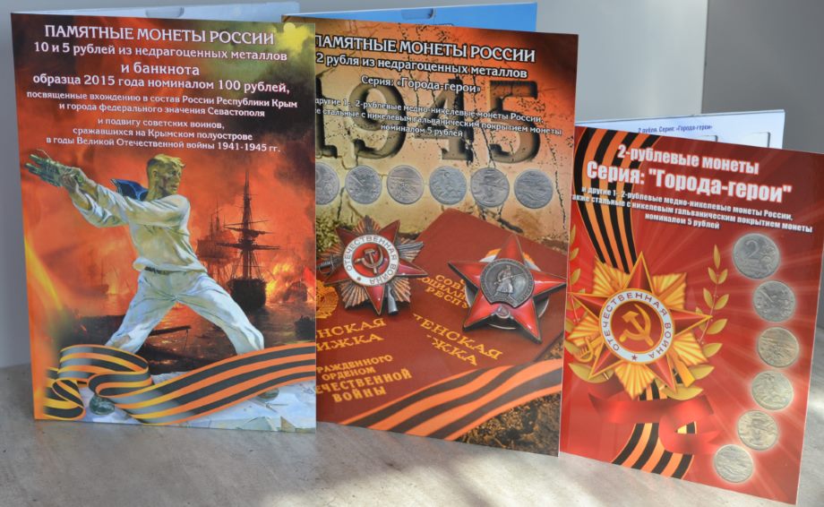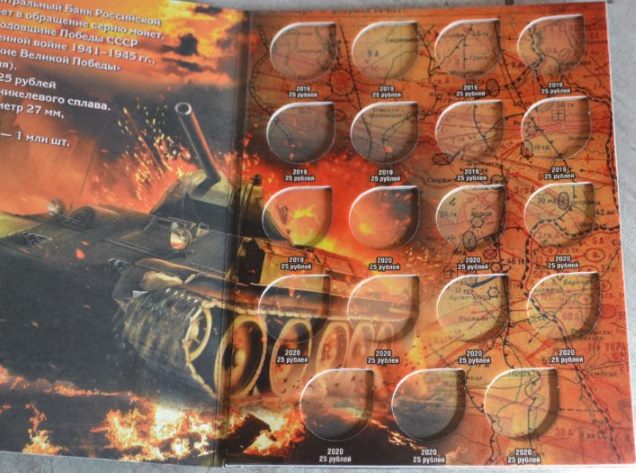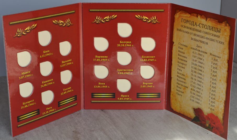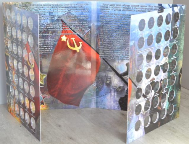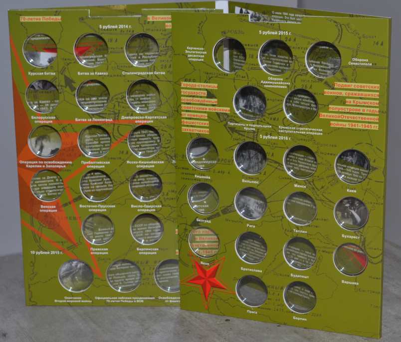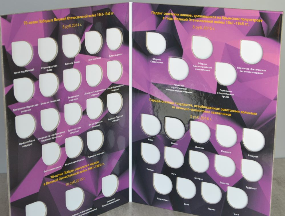1. Альбом-планшет "70 -летие Победы", предназначен для хранения 40 монет, а именно: - 5-рублевых и 10-рублевых монет, посвященных 70-летию Победы в Великой отечественной войне; - 5-рублевых монет, посвященных подвигу Советских воинов, сражавшихся на Крымском полуострове в годы Великой Отечественной Войны 1941-1945 гг.; - 5-рублевых монет серии "Города - столицы государств, освобожденные советскими войсками от немецко-фашистских захватчиков". Цена - 190 руб. 2. Блистерный альбом для памятных монет России "70 -летие Победы в ВОВ 1941-1945 г." на 40 ячеек. Монеты видно с двух сторон. Цена -260 руб. Сообщение отредактировано mebius: Jul 17 2022, 00:16 Вложенные эскизы изображений |