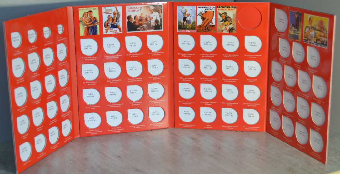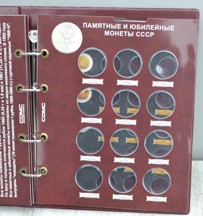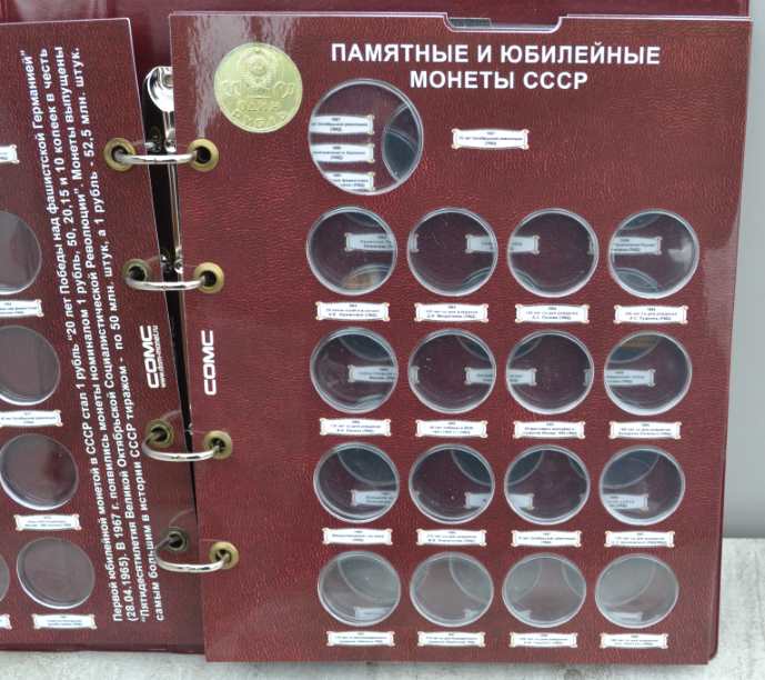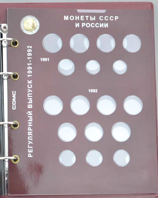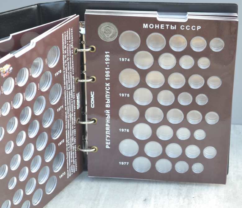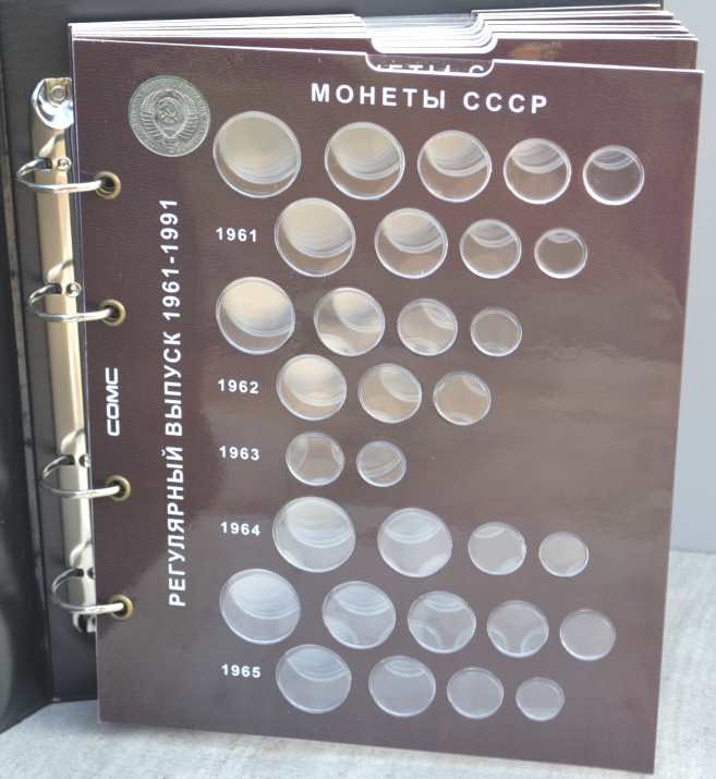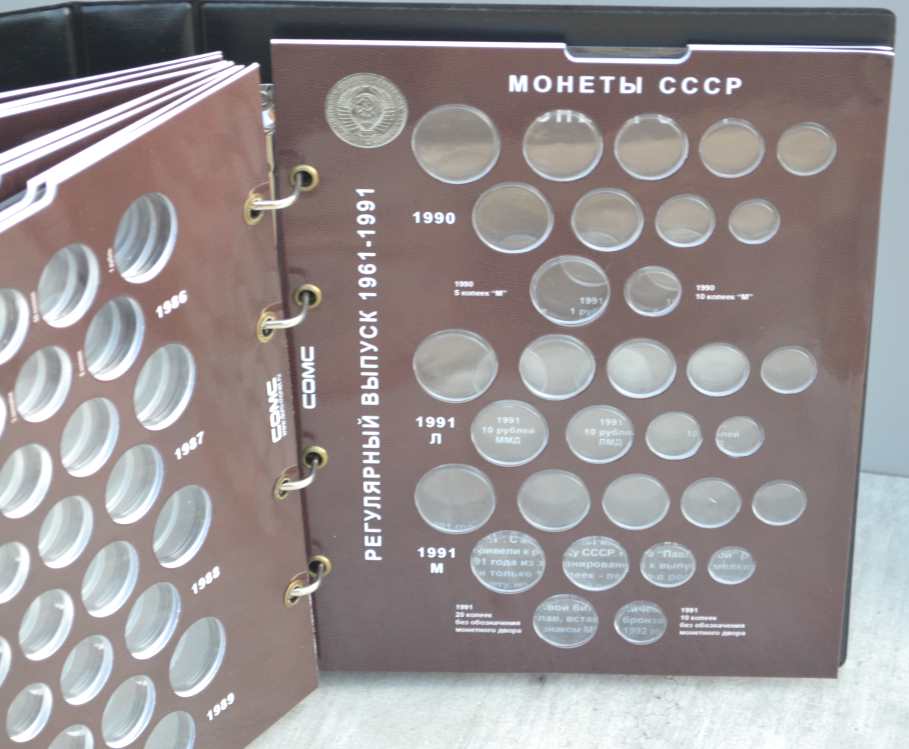 Альбом для монет на кольцах, "Монеты СССР регулярного выпуска 1961 -1991 г." с подписанными блистерными листами (9 лист.), формата "Оптима" -230х265х50 мм. Обложка иск. кожа. Цена - 1290 руб. Каждая монета имеет свое место и размещается в капсулу сделанную конкретно под ее размер. Монету можно рассматривать с двух сторон. Для того чтобы поместить монету в ячейку необходимо извлечь заслонку и вдавить монету до щелчка, после этого вернуть в исходное положение защитный пластик. Монета должна держаться в капсуле. На всех листах последовательно отмечены года с монетами выпущенными в это время. Так же на листах есть краткая информация о самих монетах (год, размер, металл и т.д.). Сообщение отредактировано mebius: Jul 17 2022, 00:26 Вложенные эскизы изображений |