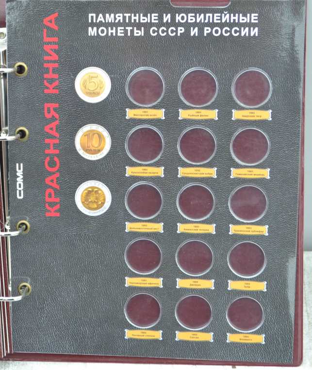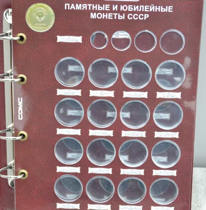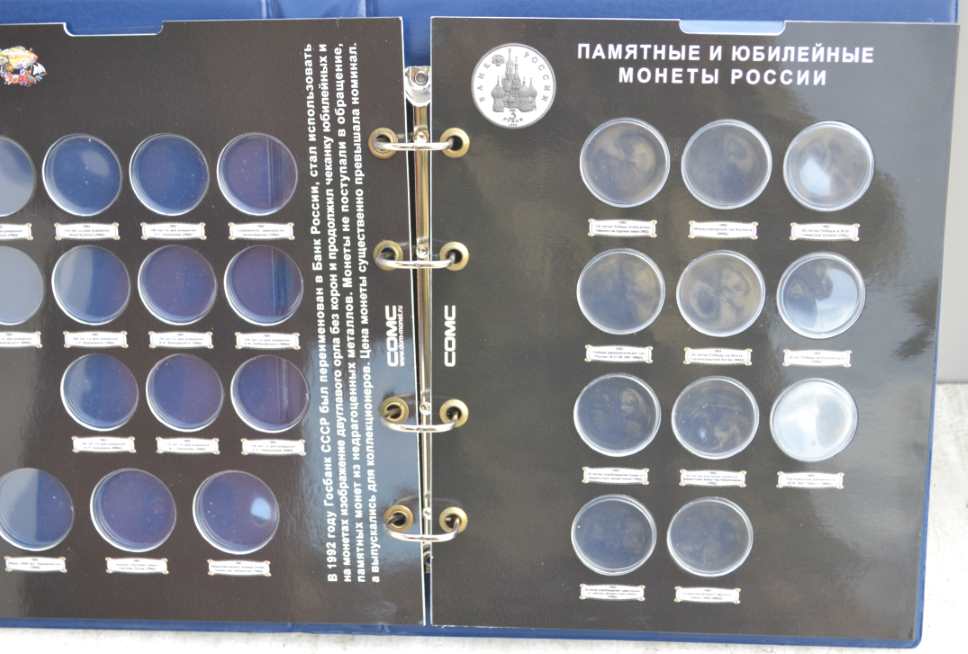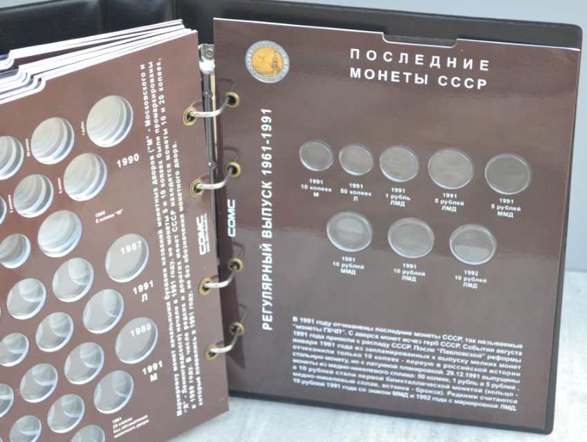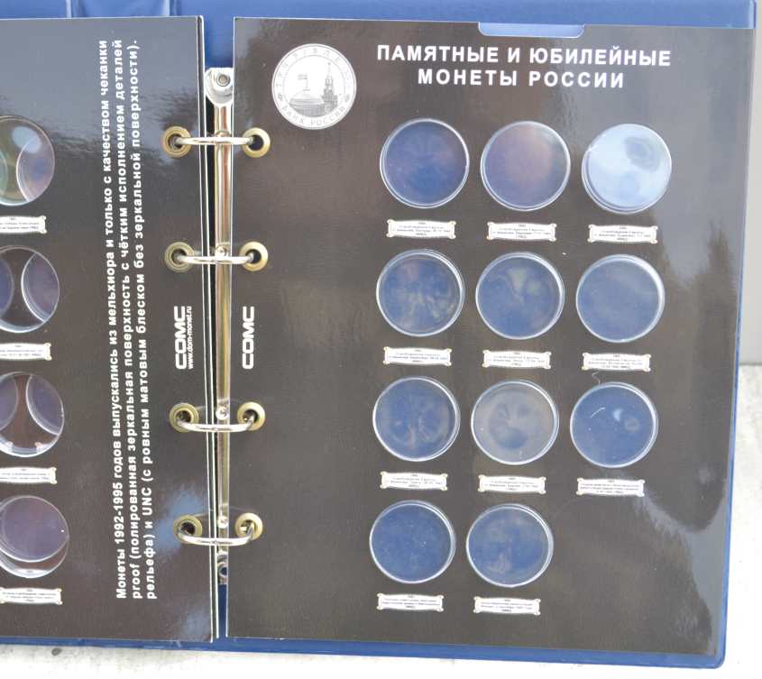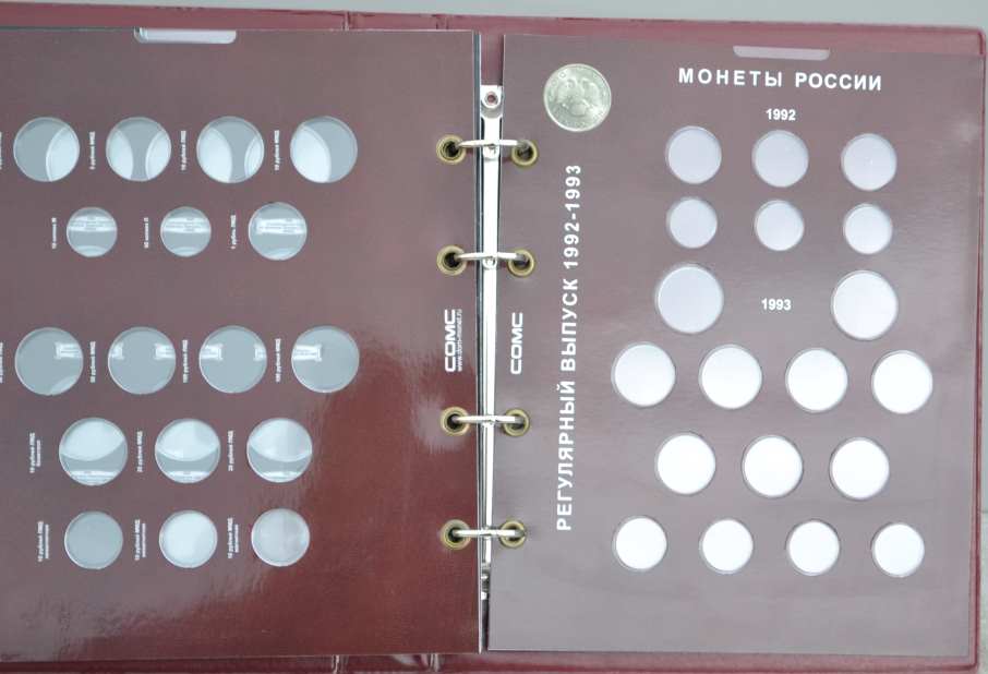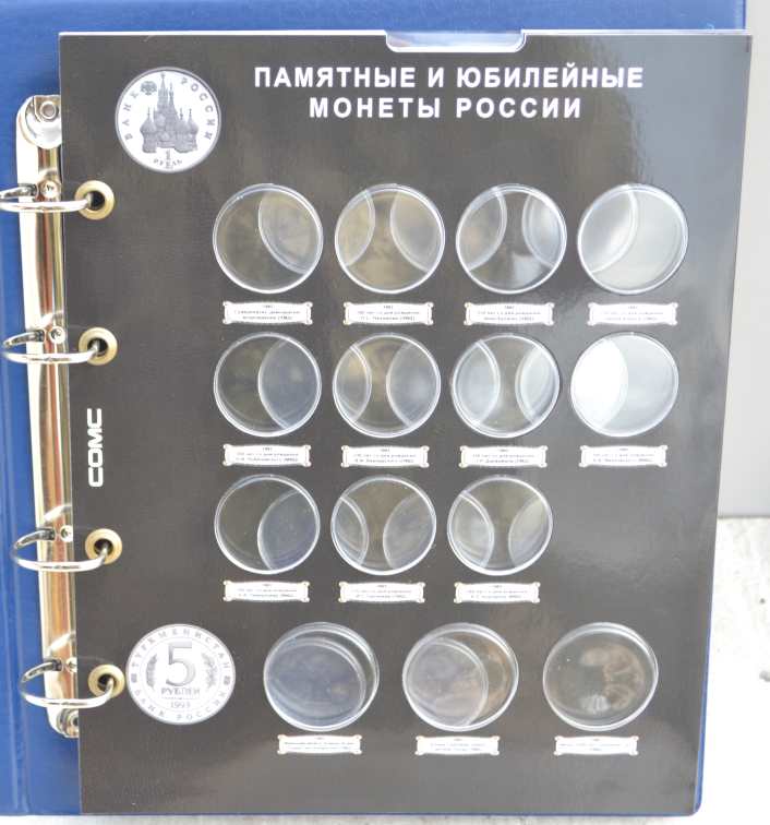 Альбом для монет на кольцах, "Монеты СССР регулярного выпуска 1961 -1991 г." с подписанными блистерными листами (9 лист.), формата "Оптима" -230х265х50 мм. Обложка иск. кожа. Цена - 1290 руб. Каждая монета имеет свое место и размещается в капсулу сделанную конкретно под ее размер. Монету можно рассматривать с двух сторон. Для того чтобы поместить монету в ячейку необходимо извлечь заслонку и вдавить монету до щелчка, после этого вернуть в исходное положение защитный пластик. Монета должна держаться в капсуле. На всех листах последовательно отмечены года с монетами выпущенными в это время. Так же на листах есть краткая информация о самих монетах (год, размер, металл и т.д.). Сообщение отредактировано mebius: Jul 17 2022, 00:26 Вложенные эскизы изображений |