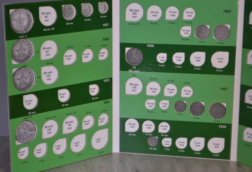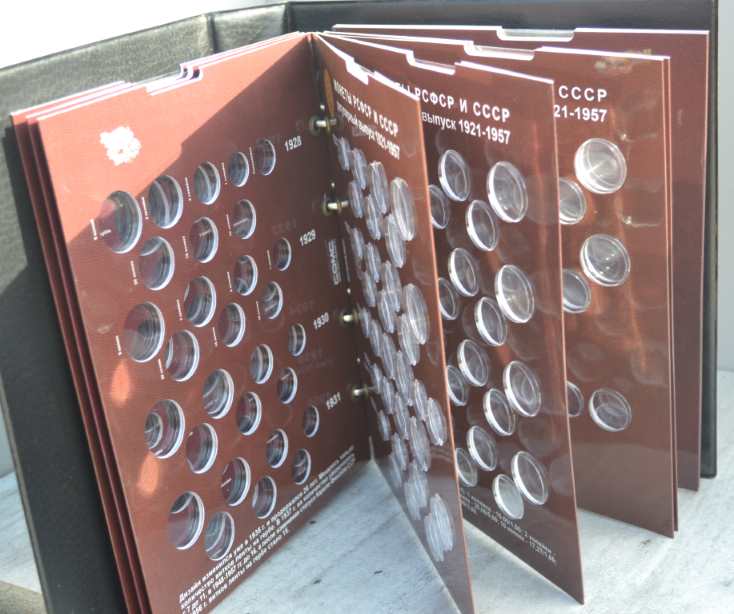 Альбом для монет на кольцах, "Монеты СССР регулярного выпуска 1921 -1957 г." с подписанными блистерными листами (9 лист.), формата "Оптима" -230х265х50 мм. широкий корешок. Обложка иск. кожа. Цена - 1290 руб. Каждая монета имеет свое место и размещается в капсулу сделанную конкретно под ее размер. Монету можно рассматривать с двух сторон. Для того чтобы поместить монету в ячейку необходимо извлечь заслонку и вдавить монету до щелчка, после этого вернуть в исходное положение защитный пластик. Монета должна держаться в капсуле. На всех листах последовательно отмечены года с монетами выпущенными в это время. Так же на листах есть краткая информация о самих монетах (год, размер, металл и т.д.). Сообщение отредактировано mebius: Jul 17 2022, 00:26 Вложенные эскизы изображений |