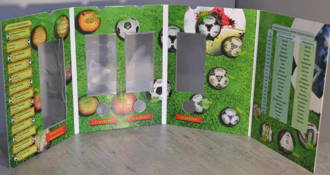 1.Блистерный альбом предназначенный для хранения 10-рублёвых стальных, с гальваническим покрытием монет, ГВС (на 70 ячеек) 165х240 мм. Цена - 220 руб. 2. Альбом-планшет для памятных монет и банкноты России, футбольной тематики. Цена -170 руб. Сообщение отредактировано mebius: Jul 17 2022, 00:25 Вложенные эскизы изображений |