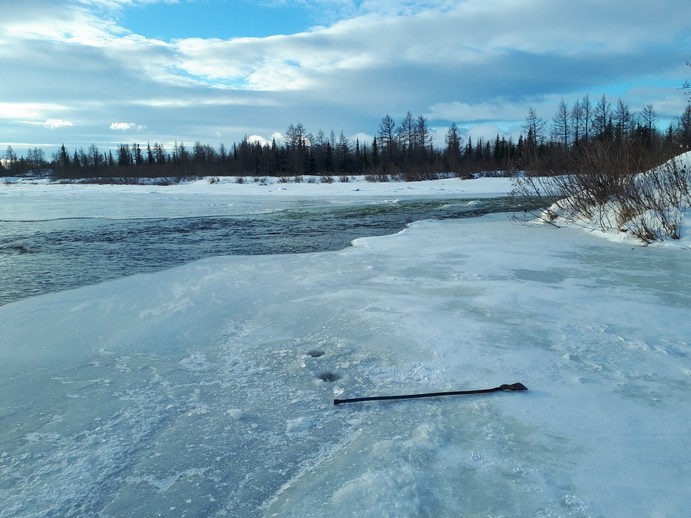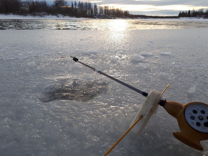 Ну а дальше - полевые испытания. В этом сезоне сюда ещё никто не ходил, шум реки был слышен более чем за полкилометра, но уж коли столько прошёл, решил, без особой надежды на успех добраться до места..сначала прочность ледяного покрова не внушала доверия, но оно не впервой и вскоре я уже пробовал лёд "дворницкой пешнёй" и ей же пробивал лунки. Хорошая веЩЩ по перволёдью.