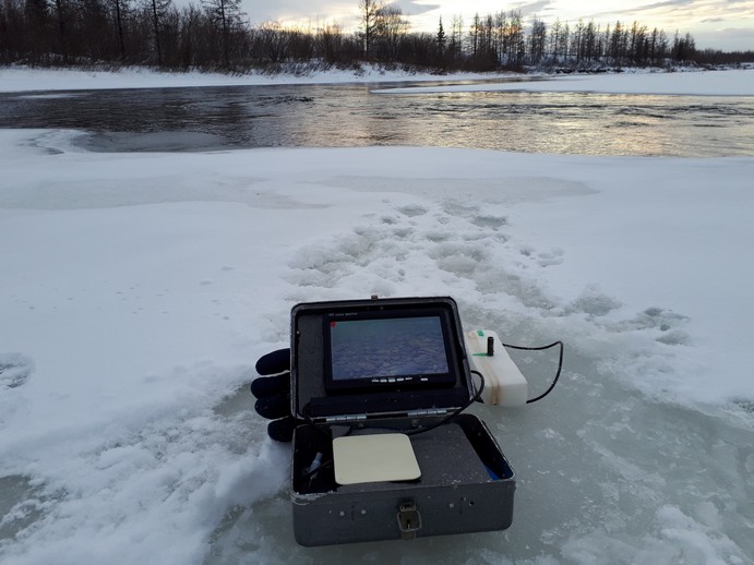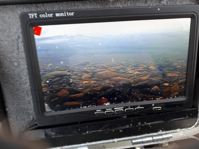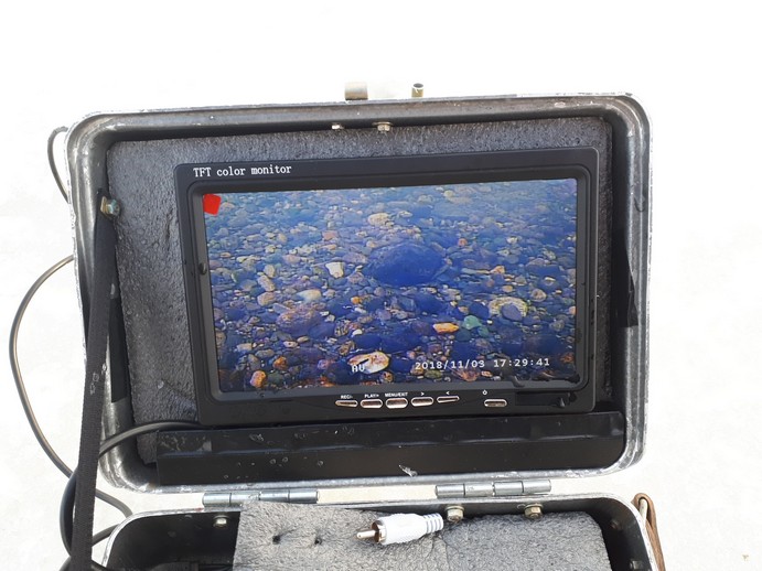 При очень большой чистоте прозрачности нашей воды подводная камера и телевизор очень полезны - хариус не боится шума и едва пробив лунку в неё можно опускать датчик на штанге и уже через несколько секунд можно оценить перспекивность места, точнее наличие здесь и поблизости рыбы. Можно смотреть вниз и на оснастку удочки, а можно - в сторону, точнее - в любые стороны, для чего надо просто повращать датчиком (камерой). Нет хариуса - идём дальше .. Ну или караулим на какой нибудь интересной точке.