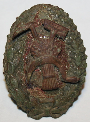 посмотрел ссылки. На все похоже. Но! В том месте исключительно назодки 20-30-х гг. Но может и случайно занесло. Сзади основа для усиков на грабельках и снопе почти по центру. Да и размер. Непонятно как бы он крепился на знак с-х. Наверное все же это накладка на продотрядовский знак . Может еще кто поправит. Правда по цене, я так думаю, это бесценно