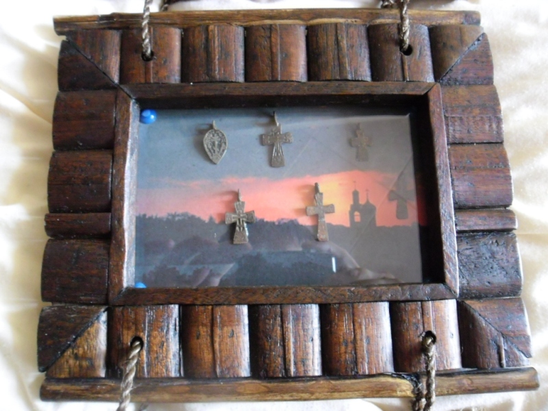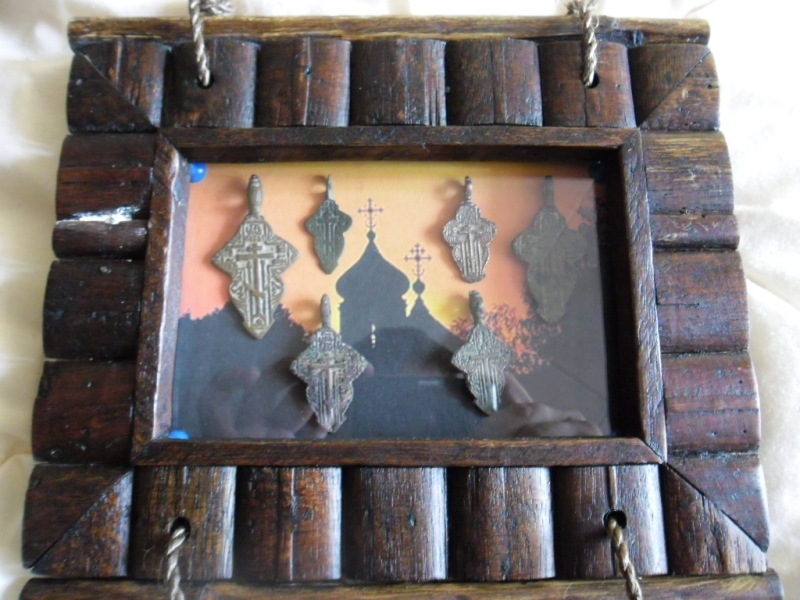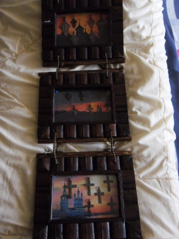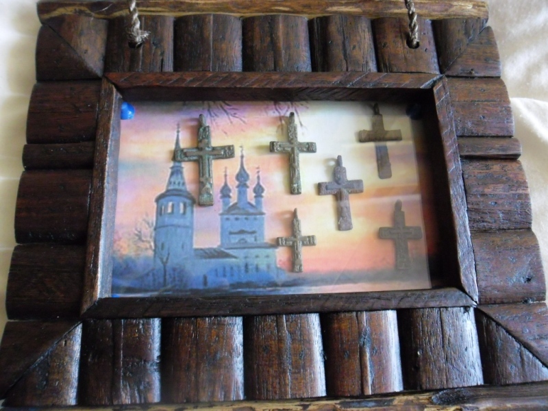 Здравствуйте,вот и моя проба пера.Где то на форуме видел оформление крестиков на фоне церквей и очень зацепило и вот собственно,что вышло.За фон заранее приношу извенения так как еще не подобрал место куда повесить,так как доделываю второй такой комплекс ,только на зимнем фоне.