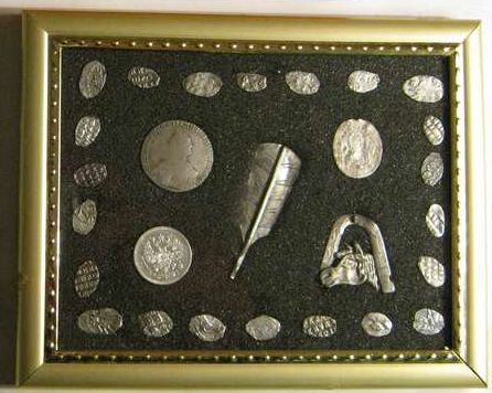 Просто в качестве фона-подложки использовал, попавшийся под руку тонкий (около 5 мм.) листовой поролон чёрного цвета. Монетки в него вдавились и отлично держатся. Тем более что, они разной толщины. Серебряные монеты и другие вещи неплохо смотрятся именно на чёрном фоне. Вложенные эскизы изображений -------------------- В жизни каждого мальчишки наступает момент, когда ему хочется копать землю. (с) Марк Твен.