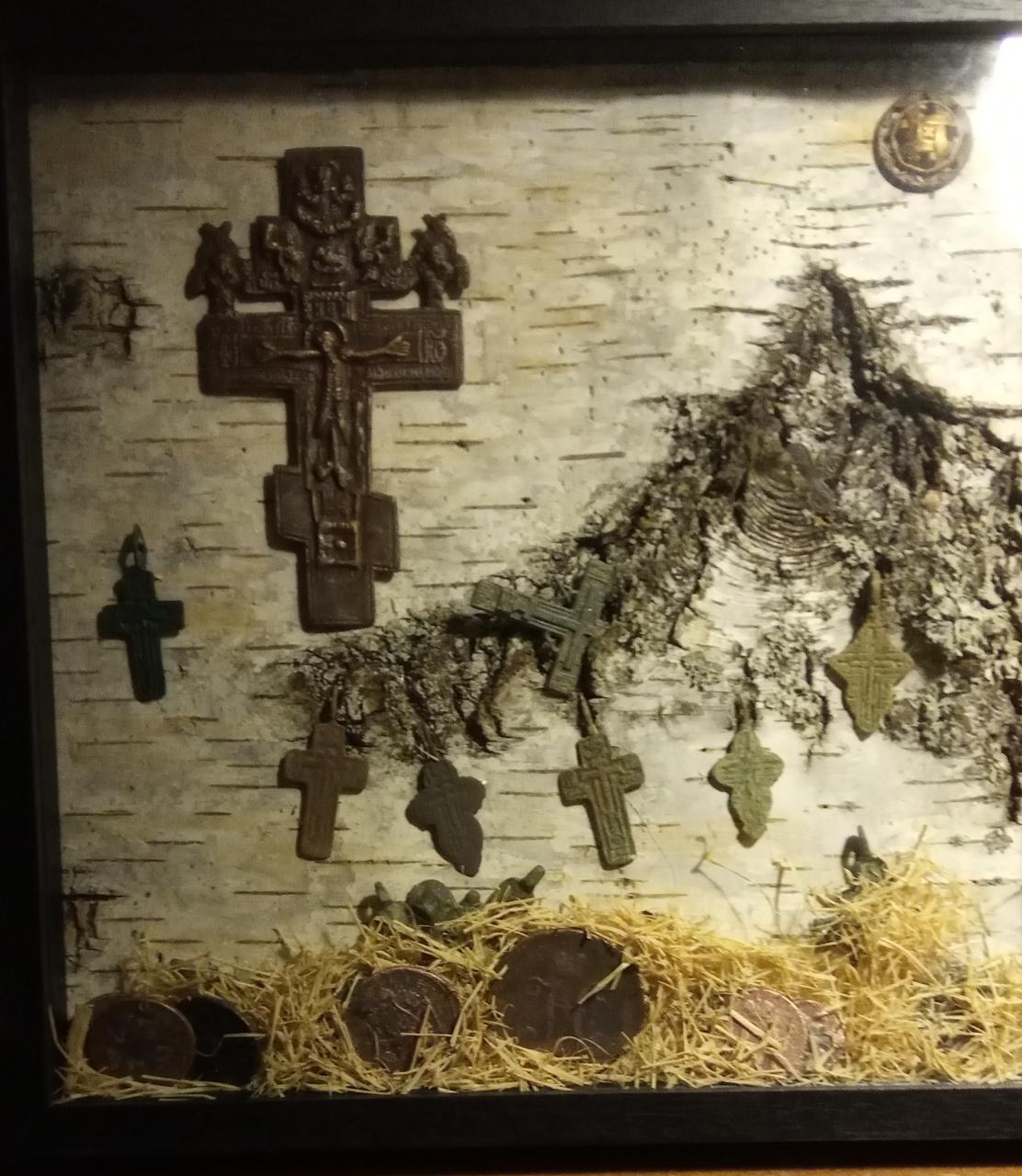Уж если и брать бересту как фон, то она должна быть ровная, без сучков. Сено лишнее, да. Напоминает клетку для кроликов. Лучше используете грубую льняную холстину, чем берёзы портить.