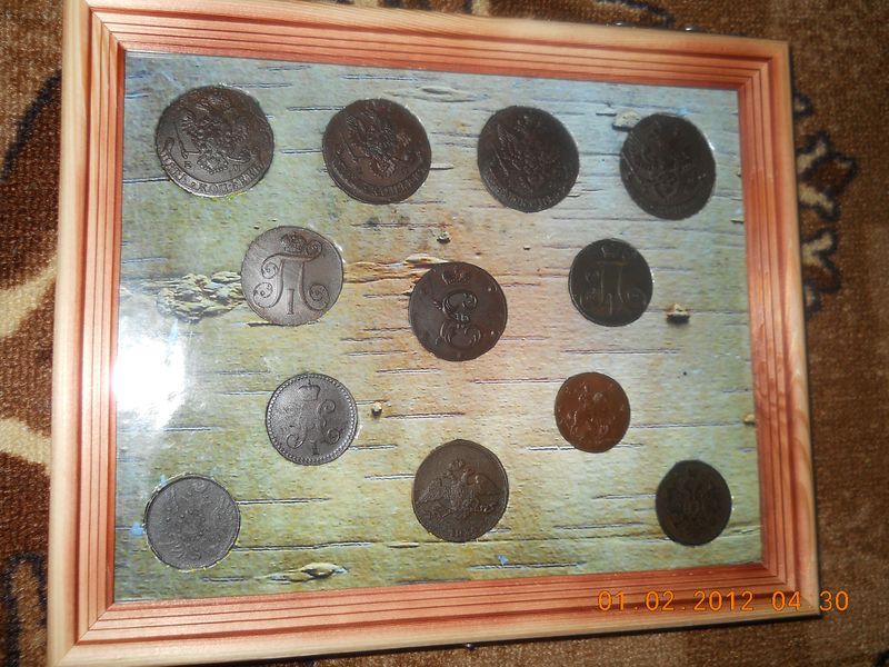 Доброго всем здоровья! Вот решил оформить монетки в рамочку. Читая тему, много почерпнул для себя, а кое что использовал в своем творении. В живую естественно смотрится красивее, жена даже похвалила, не зря говорит два вечера потратил. Ну это жена, теперь выставляю на ваш суд...