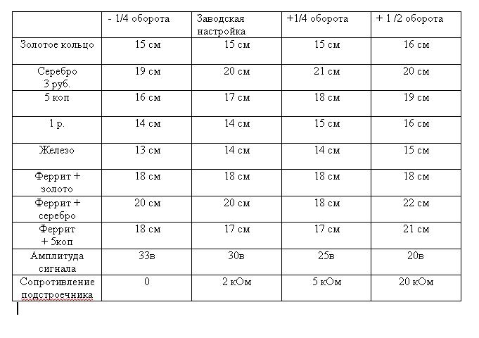 На воздухе чувствительность действительно возрастает(крутил по часовой стрелке) но в поле резко ухудшилась отстройка от грунта,появилась куча ложных сигналов,а в случае истинной цели сигнал стал очень размытым и нетипичным,цель трудно локализуетися. Кроме того,прибор стал реагировать на камни.Поворот резистора назад все прекратил. |