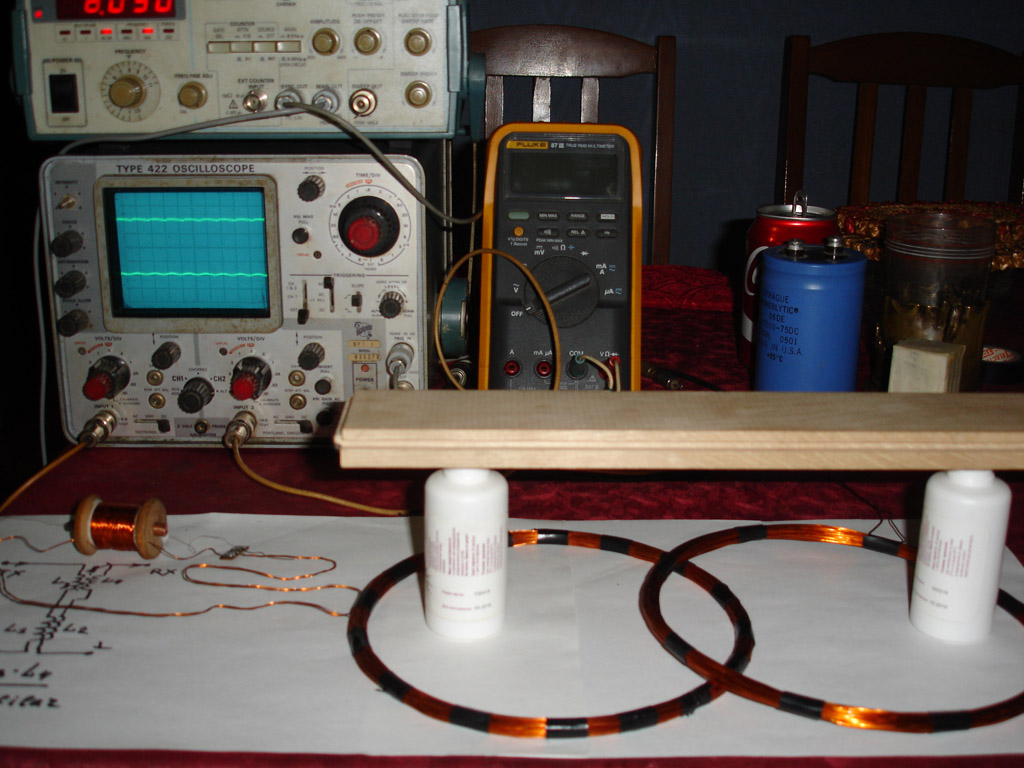 Теперь мы ставим над катушками простое приспособление для перемещения цели на одной высоте , подключаем вторую катушку к осциллу и балансируем её , вот так . Теперь на двух каналах осцилла два сигнала - нижний луч , это датчик DD , верхний - однокатушечный : Всё готово к решающему эксперименту .... |
