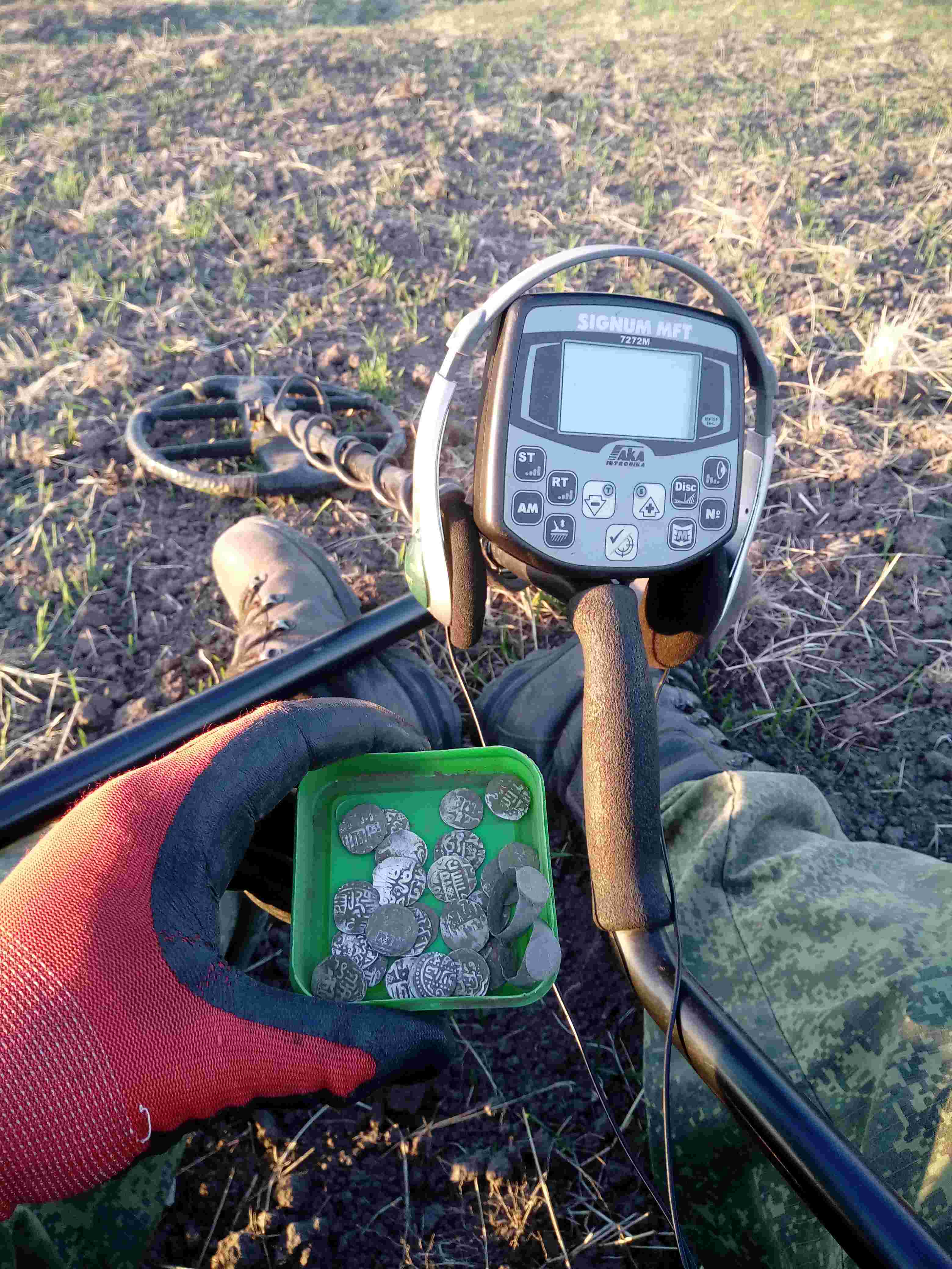 Вот и наступил момент,когда я могу поделиться с Вами своей историей про клад! Сегодня, на покров день, выпал выходной и я с друзьями отправился на коп,в старую деревню,там трактора перепахивали поля и хотелось посмотреть на перспективные места.Прибыв на место мы увидели хорошо распаханное поле,поле разделяли овраги,по краю стоял лес,красивое местечко подумали мы и взяв приборы принялись за дело.Прошло около 3х часов,а находок не было,мы уже нашли сосредоточение керамики,но вот не задача цветных сигналов почти нет.Только из редка появлялись сигналы от проволки и запчастей тракторов,уже все смотрели по сторонам и думали куда пойти,где монеты.И вот проскакивает слабый ,но четкий сигнал под катушкой моего прибора,я сначала подумал проволка под катушкой и отбросил ногой землю,сигнал усилился до монетного и годограф показал четкий вектор на мониторе прибора.Я копнул на штык лопаты и в глаза сразу бросились белые кружочки,я начал их собирать,казалось ,что от этого дела перехватило дух .Прозванивая это место, я поднял с одной ямки 8штук данг(дирхемов) и рядом в радиусе двух метров еще 17штук,по сопутке нашел 3 кольца.Да вот еще чуть не забыл,перед тем как найти монеты буквально за пол часа,я закопал конфетку земляному деду и вот верь или не верь в эту примету ,но в данном случае она сработала!!! Спасибо за внимание. Пойду отмечу это дело. Вложенные эскизы изображений -------------------- Кто ищет — тот всегда найдет!