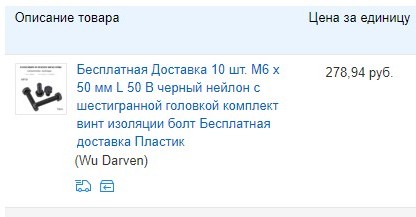 QUOTE(AMYRSV @ Mar 8 2019, 00:07) Спасибо за совет, но я не первый раз на Ревью Кстати, недавно товарищ посетовал, что наткнулся в нескольких магазинах на отсутствие крепёжных винтов для катушек Тёрки (минимимум 100 руб.), а там, где были, стоили от 200 до 300 рублей. Разумеется, меня этот вопрос тут же заинтересовал в разрезе данной ветки. Итогом стали два заказа (а то и у меня всего парочка живых осталась): То есть 10-ть винтов (M6х5см) и 10 барашков на них стоили суммарно аж целых 412 рублей (как будто тут взял 2 шт.). То есть 1 крепёж достался по 41-му рублю. Что, конечно, дороговато. Ибо если я бы взял штук 100, то уже там цена в расчёте на штуку упала бы раза в два примерно (за 1000 вообще молчу, там воообще копейки). Но уже заказал, мне не для продаж, пару оставлю себе, а остальные просто подарю друзьям, у кого нехватка (за символические 10руб., у меня отец так всегда делает, если дарят внезапно и непойми за что, типа от сглаза). Да, ещё актуален попрос про качество, но тут уже только по получению проверю в полевых условиях, обязательно отпишусь, ждать недолго. Хотя более чем уверен, в свете последних событий с Тёркой, что не только блоки и наушники, но и винтики шли явно не из Австралии Сообщение отредактировано DVD: Mar 8 2019, 07:03 -------------------- https://www.youtube.com/watch?v=jGpH3AD_Mj8