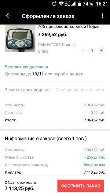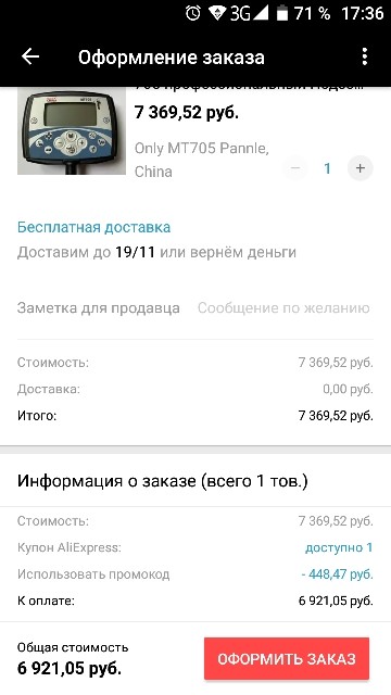 Как и собирался - взял только блок. До распродажи цена его, как выше тут отмечалось, была чуть больше 8 т.р., а сейчас продавец выкатил цену в 11 т.р., но сделал скидку аж в 31%, что даёт промежуточную стоимость в 7919,75 руб., т.е. чуть ниже, чем до распродажи. Но вот не помню, чтобы ранее там была платная доставка, а сейчас она есть - "Доставка: 531,11 руб. В Russian Federation через EMS". То есть суммарно общая сумма на текущий момент: 8450,86 руб. Нихрена себе "распродажа", скажете вы, и будете правы. Но, как я уже упомянул, обычно на распродажах есть такая фишка, как купоны. Как правило, они стандартного номинала, в 1-2 USD, и экономия тут мягко говоря, сомнительная, а по правде в свете небольшого поднятия "распродажных" цен примерно на эти же величины, по сути её просто нет. Но это - в общей массе "мелких купонов". Но бывают купоны бОльшего номинала, к примеру, 3/5, или 5/25, или 8/40, или 10/100 и т.п., т.е. первое число - скидка, второе - сумма покупки, на которую эта скидка сработает. Вот только такие купоны есть смысл получать и тратить на крупные покупки, причём допником идёт возможность покупать на эту крупную сумму не один товар, а применять её на всю суммарную корзину, главное, чтобы общая сумма была соответствующая. В случае с данной покупкой я применил купон 10/100 (за монеты из мобильного приложения), и итоговая сумма блока с доставкой у меня вышла 7690 рублей (что больше 100 USD). Так что ждём-с посылку. Хотя отмечу, что некоторые хитроделанные продавцы не всегда любят продавать товары с купонами, морозя отправку и возвращая потом деньги, "сжигая" при этом купон (при возврате денег он, увы, не возвращается). У меня так на НГ сгорел купон 5/25 на роутер xiaomi. Но тут нужно выбирать продавцов с репутацией и хорошим числом продаж - они редко так поступают. Да и купон бывает далеко не один - у меня на эту распродажу есть ещё аж целых пять - 10/69, 6/60, 5/50, 2/20 и 2/10 только вот тратить их уже не на что. Хотя есть ещё над чем подумать... Как (если) получу, опишу свои личные впечатления о товаре, благо есть с чем сравнивать и на чём тестировать - есть родной блок от Минелаба, есть родные катушки, есть катушки Марса и Нела. Не в качестве рекламы, а лишь в плане "мужик сказал..." Сообщение отредактировано DevaD: Aug 29 2019, 10:49 -------------------- У меня есть любимый цветок С зубами как тысячи спиц И если бы не горшок Он мог бы ловить даже птиц