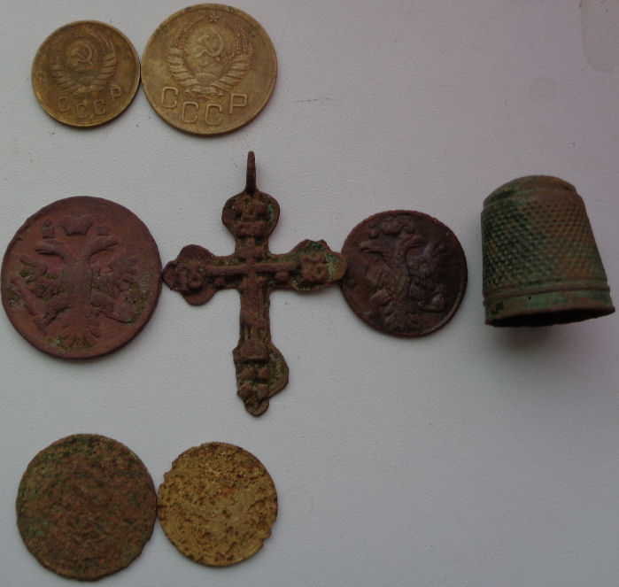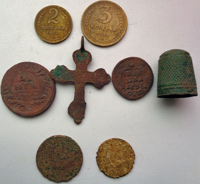 Верхний ряд найдены на относительно высоком месте, в том месте в основном ольха растет. Второй ряд предметов найден примерно в таком же месте километром - полутора южнее, располагались на площади 1 кв.м. там же были еще три чешуйки Петра первого. А вот третий ряд, две монетки лежали рядом но место низкое, мокрое и лес еловый. Вот такая вот разница о одном лесу по сохранности! Вложенные эскизы изображений |