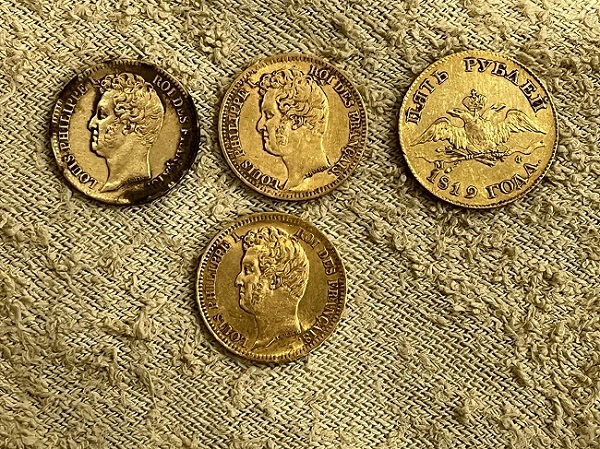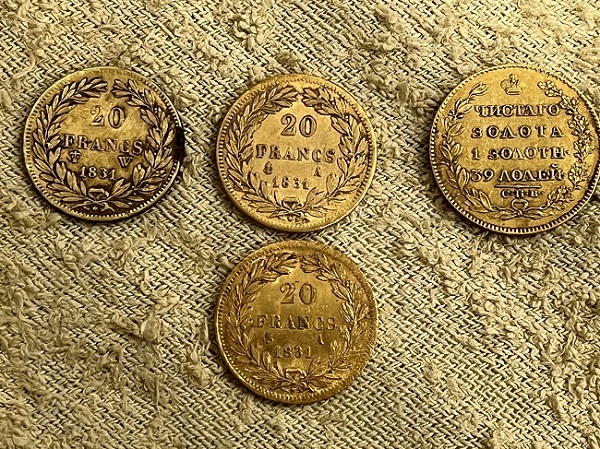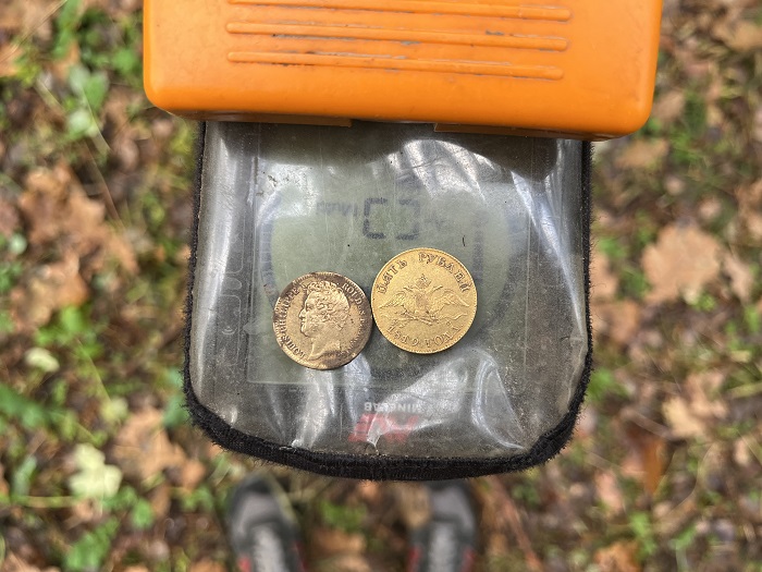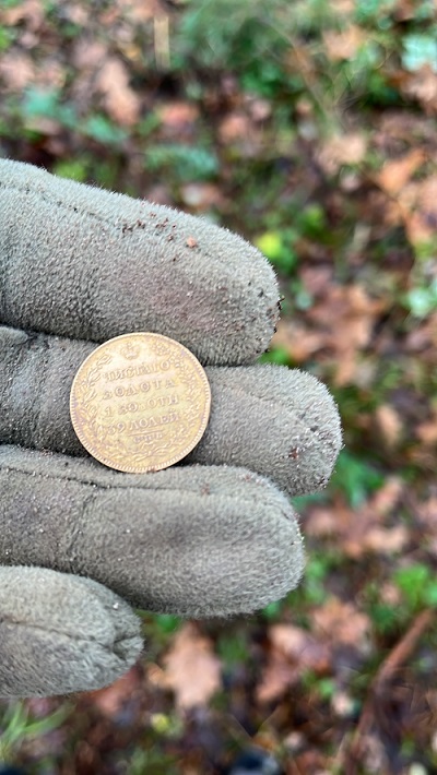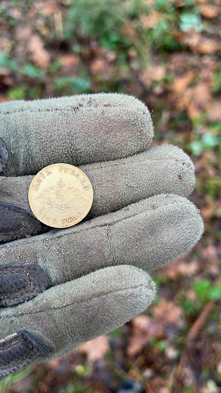 В общем расскажу свою сказочную историю блужданий по лесу. Купил дом в Подмосковье, рядом само собой лес. Когда делать бывало нечего и свободного времени было часа 2-3 уходил в лес просто так побродить с прибором. Наткнулся там на селушку 15-16 века. Периодически тратил на ее выхаживание 2-3 часа. Вытоптал достаточно хорошо ее. И в один прекрасный день отошел от нее метров на 50, думал может потеряшки какие попадутся. Под сосной словил сигнал, выкопал его и достаю пин. Смотрю в песке монета желтого цвета, беру в руки, протираю песок, а там 5 рублей 1819 года. В прямом смысле слова сел на жопу, скурил сигареты 3-4, собрался с мыслями и думаю надо пятак этот выходить. Провожу над ямкой еще сигнал, вылетают 2 монеты 20 франков 1831. Думаю надо еще сигарету выкурить, после провожу еще раз и вытаскиваю еще 20 франков. За качество фото извиняюсь, сконцентрироваться там не мог