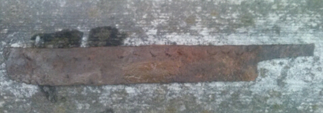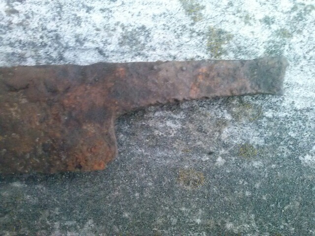 Здравствуйте, сегодня попался вот такой обломок, стало интересно от чего, побыстрому на телефон сфоткал, по одной стороне выбиты полумесяцы. общая длинна 29 см, ширина около 3,5 см. Позже будут нормальные фото.