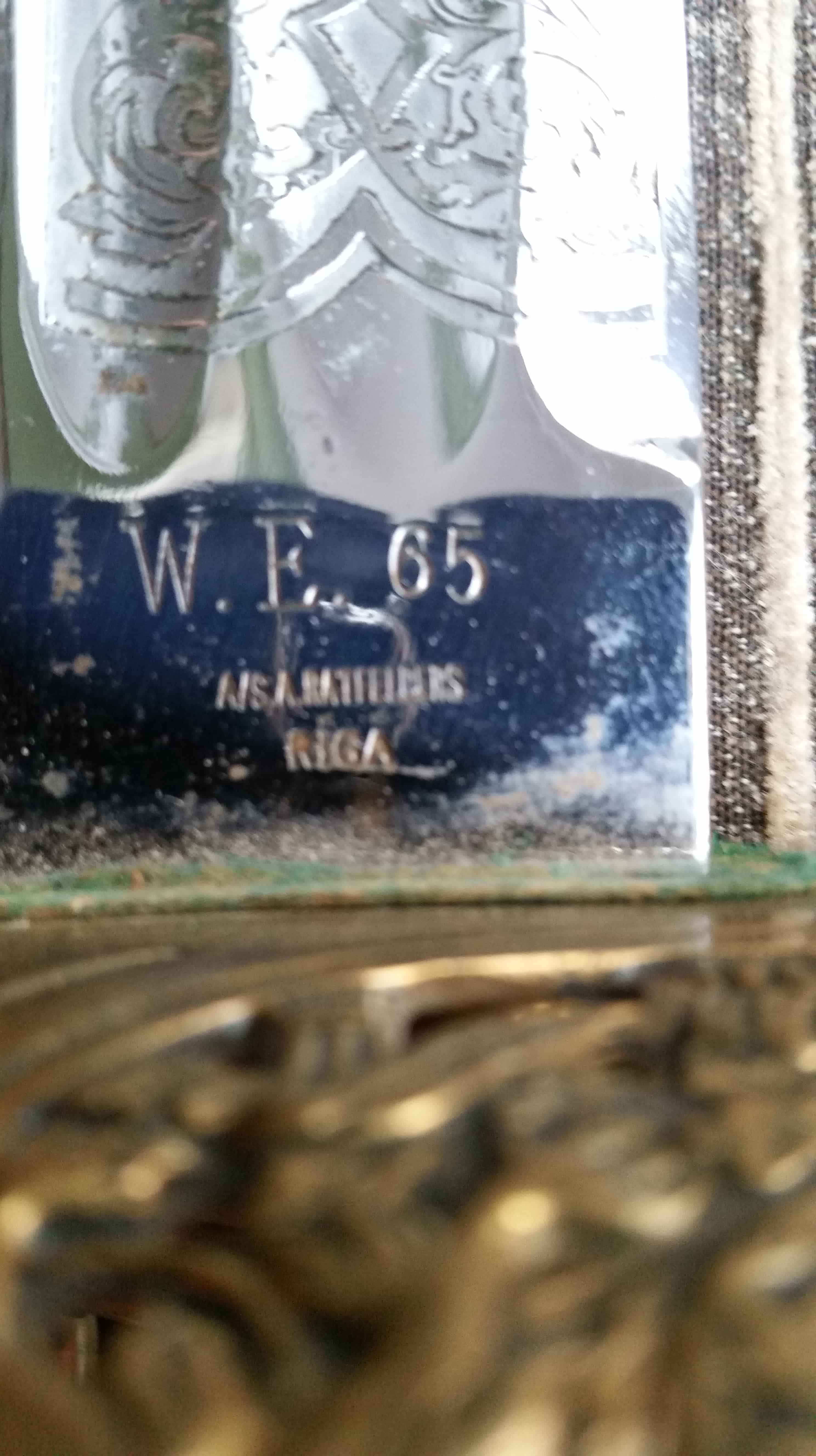 QUOTE(Tsur @ Dec 10 2016, 10:27) Здравствуйте уважаемые,прошу подсказать что обозначают буквы и цифры w.e. 65 на клинке сабли,и герб на гарде-родовой?С ув. Герб государственный ( латышский ). -------------------- ВСЁ - это когда под портретом вторая дата появилась...