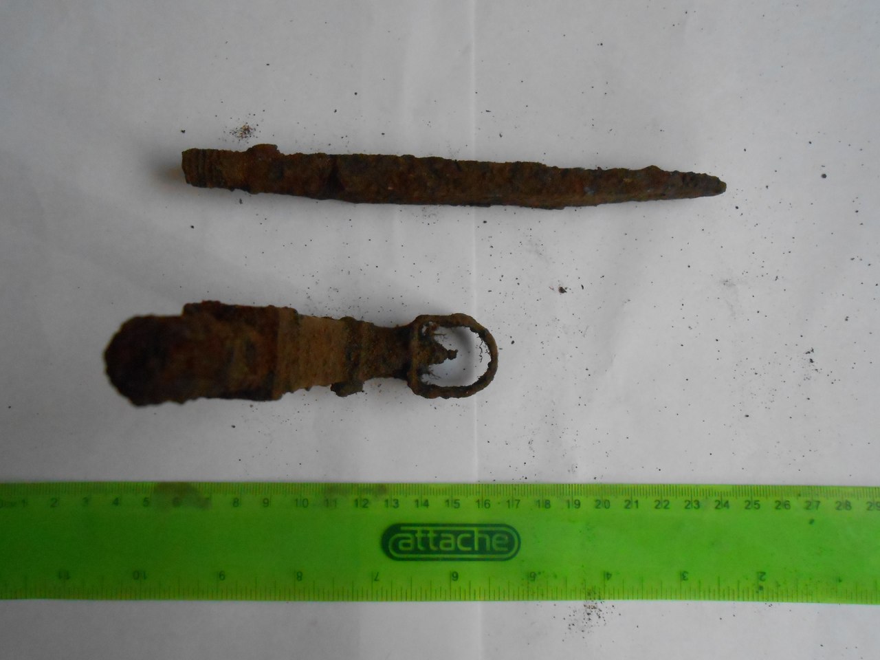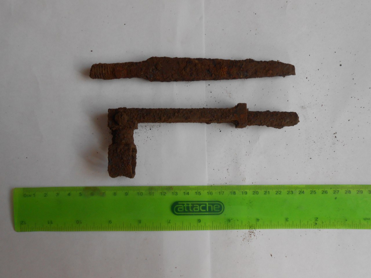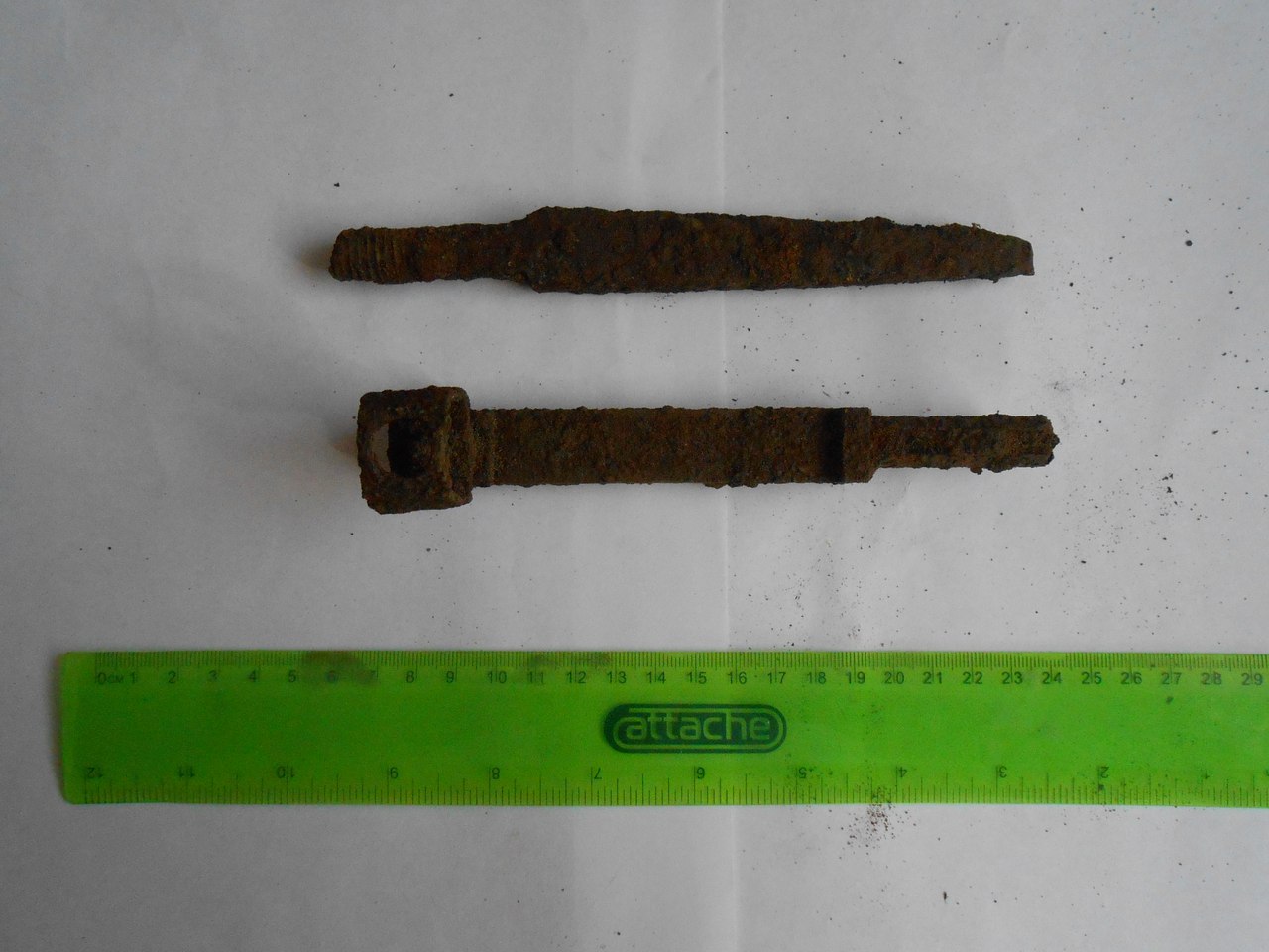 Здравствуйте! Может кто подскажет, от чего это? Верхний вроде наконечник копья, а внизу? Поселение с 11 века. Похоже на путейский костыль, квадратное сечение, цельно-литое,находилось довольно глубоко. Северо запад России. А может заготовка для дальнейшей ковки ,просто как вариант .. |