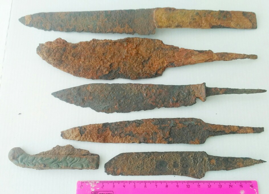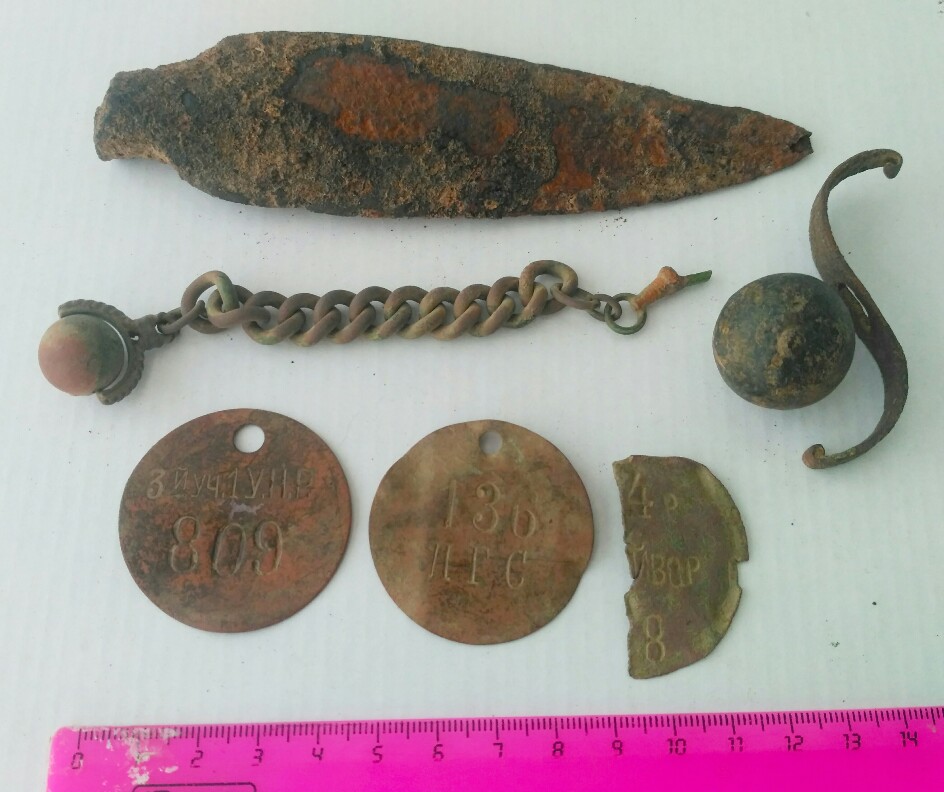 Ещё находки на определёние, подскажите это увольнетельные жетоны? Гарда от кортика, наконечник от копья, что то круглое и на цепочке, как по старту для аук?))