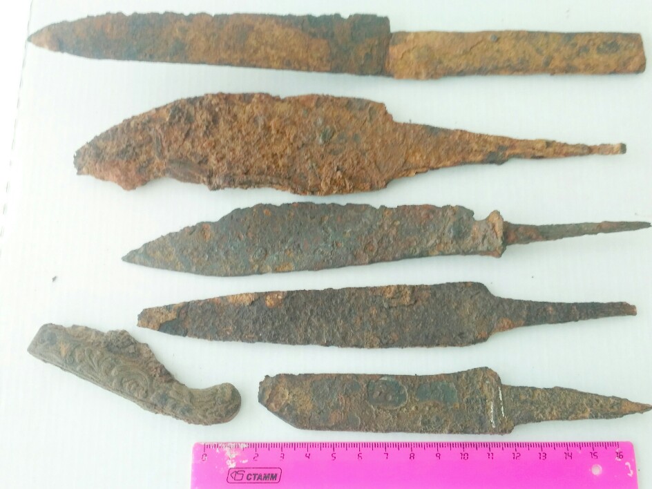 И ещё на определёние и оценку 2 дела от пещали, одно с потерей и большое лезвие.... И набор инструментов, вроде все были упакованы в бересту