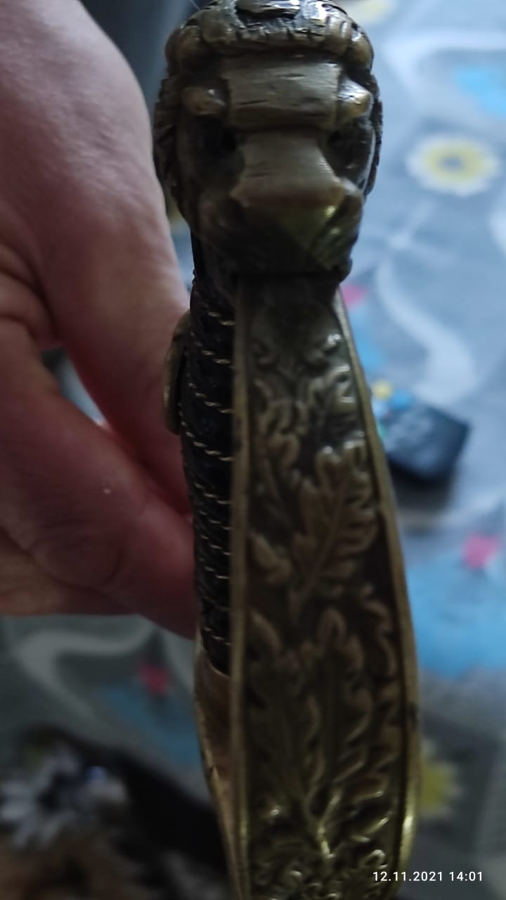 QUOTE(удав @ Dec 25 2021, 05:36) Доброе утро хотел узнать что это и почем Доброе! Офицерская парадная сабля была. По 3 рейху. Там у Вас видно, как орла со свастикой затерли, только кончики крыльев остались. Клеймо Alex Coppel. У льва камешки из глаз выковыряли...((( ![]() Вот точь в точь Ваша продавалась с описанием: "Эфес «блюхеровского» типа, состоит из рукояти и гарды. Рукоять черная эбонитовая, с поперечными желобками, перевитыми позолоченной витой проволокой. Все элементы гарды изготовлены из позолоченной латуни, навершие рукояти сабли изготовлено в виде головы леопарда с красными ограненными камнями в глазах. Гарда образована R-образной защитной дужкой, имеющей небольшое расширение в средней части, под прямым углом переходящей в крестовину, конец которой выполнен в виде завитка и загнут вниз. От перекрестья в средней части, по обеим сторонам от пяты клинка, отходят вниз два щитика. На щитике с лицевой стороны изображен орел со свастикой в обрамлении из венка. Щитик с обратной стороны – гладкий. Все элементы гарды изготовлены из позолоченной латуни. ![]() Сообщение отредактировано MrFix: Dec 25 2021, 23:00 Вложенные эскизы изображений |
