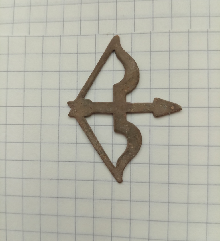 Всем привет! Вот поднял непонятный толи значок,толи эмблема.Крымский район Краснодарского края.Рядом окоп боевого охранения. Сопутка- ганс- пуговицы и кусок эмблемы "Эдельвейсов" с ихней кепки. Материал тонкая медь. С обратной стороны такая же гладкая поверхность.У кого какие мысли,что это?