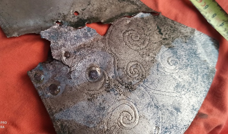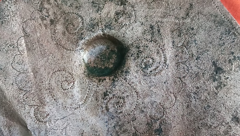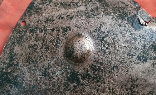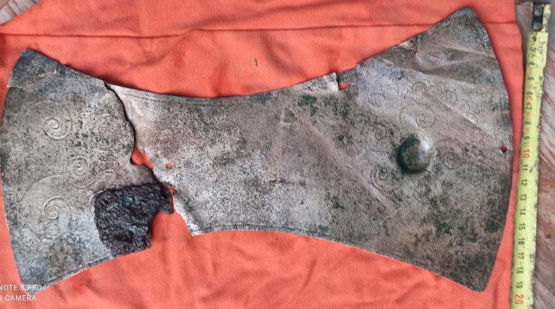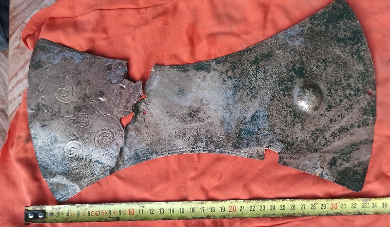 Всем добрый день. Находка выкопана в Ростовской обл. Багаевский район. На поле, плуги не доставали. Бронза размером 350 на 200 мм. Была лопнула и заклепана в то время металлической заплаткой. Вся была в наросте и темно зеленая, пришлось чистить, что б увидеть орнамент. Недалеко подняли "Капусту" 1823 года, вокруг курганы. Заранее спасибо. с ув. Александр