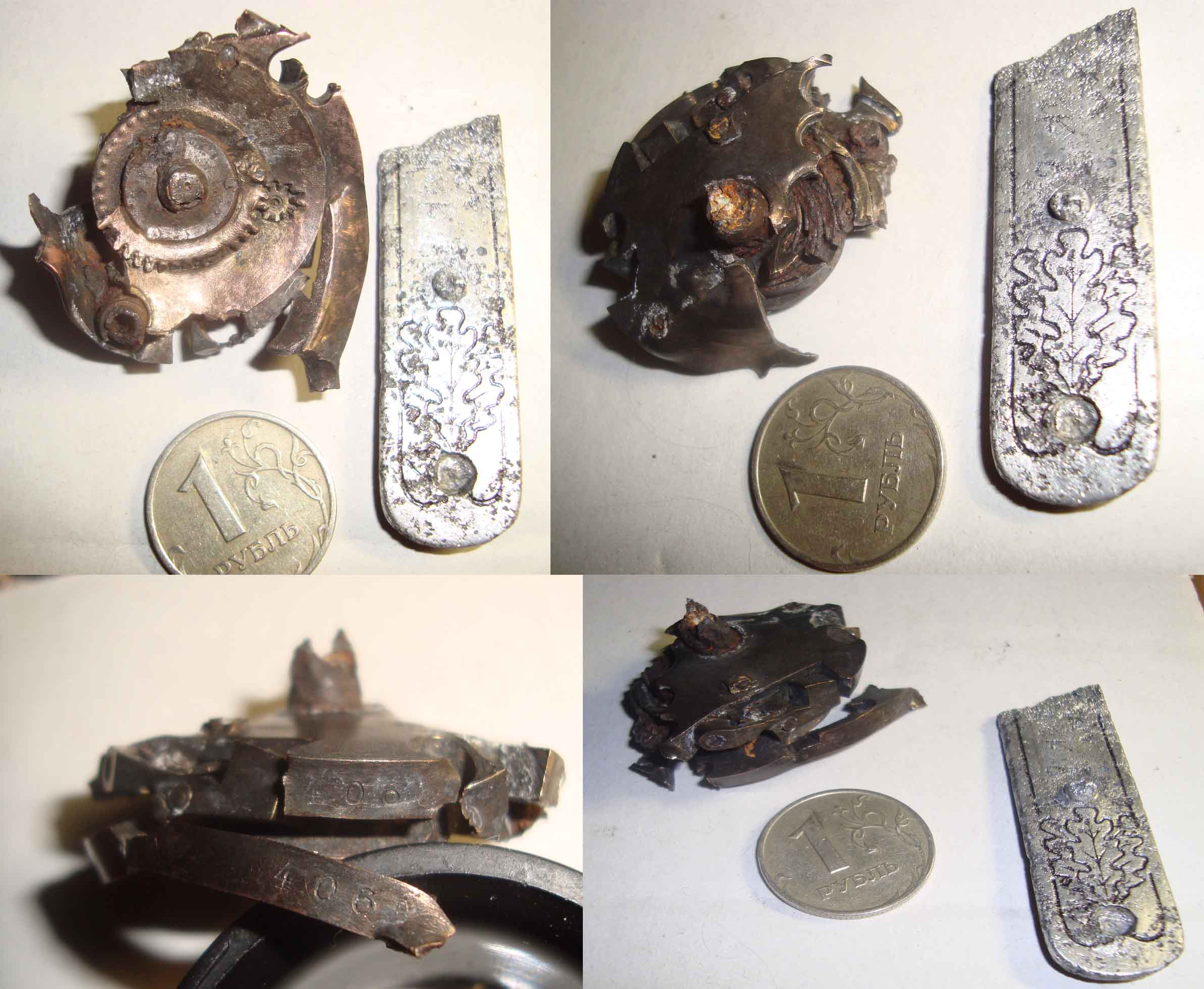 Подскажите пож по "находкам". Просто животный интерес по поводу останков предметов 1)похож на разбитый часовой механизм.. пружина,шестеренки. Бронза,есть цифры "4056" в 2 местах. Может от бомбы механизм был? Подскажите, кто сведущь. 2)Нашел нечто гнилое. В руках развалилось. Стальная пластина отпала гнилая в хлам. Люминевая часть тоже рассыпалась,Кусок,который остался взял просто для эксперементов по чистке. В результате вылезли дубовые листья с желудем. Были нацарапаны буквы германские с обеих сторон, но они "ушли". Предпологал, что от вилко-ложки часть, но не нашел в сети с таким рисунком. А это штамповка, значит в тираже было..От чего это часть? Спасиб за ранее! |