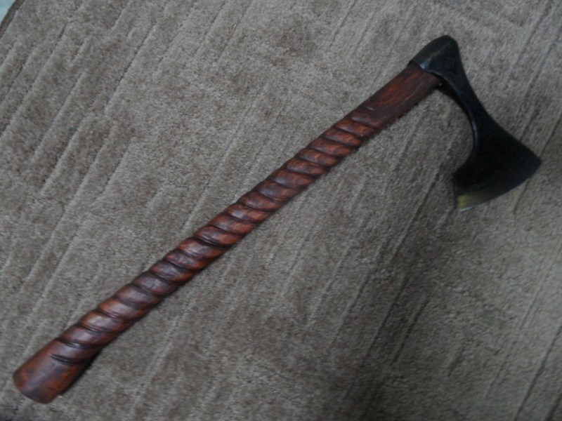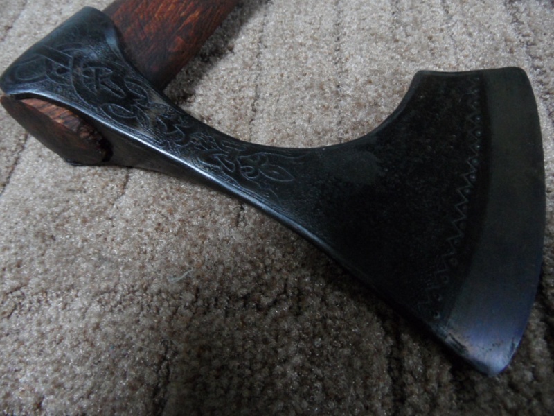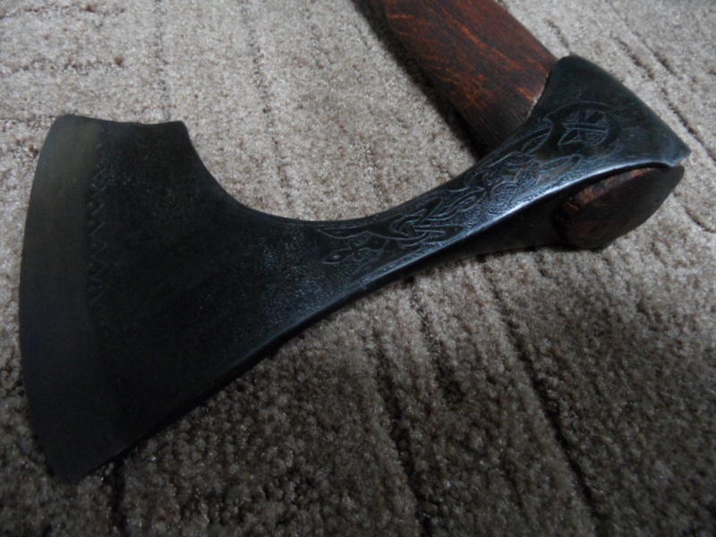 Очередной топор.Делал для нашего форумчанина,на присланном мне ,боевой части как таковой не было,проржавела,в своих запасах нашел кусок недостающий,сварил,подварил обух,ну и соответственно пришлось опять чистить в ноль,что получилось- на фото.Думаю что лучше чем было изначально.Топор заворонил,рукоять вырезал из вяза ,застарил и тоже затонировал.Рисунок резал штихелями.