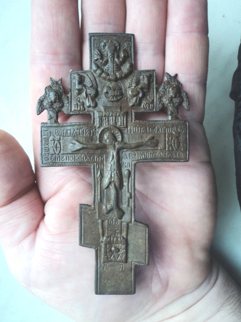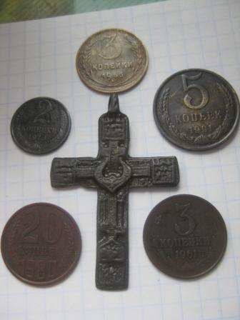 Воскресная находка с огородной межи. Любопытно, что дед - владелец огорода сообщил, что "...когда копали огород, попадались кресты, жетоны всякие. Так, что, ходите, ребяты". И действительно, многое было как раз на меже, куда обычно бросают всякий инородный материал, мешающий вскопке.
