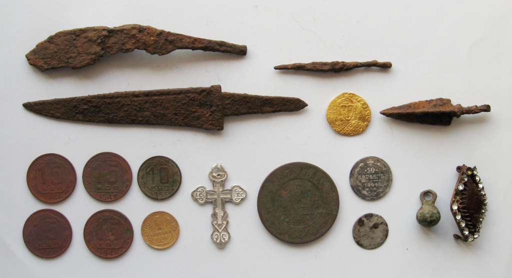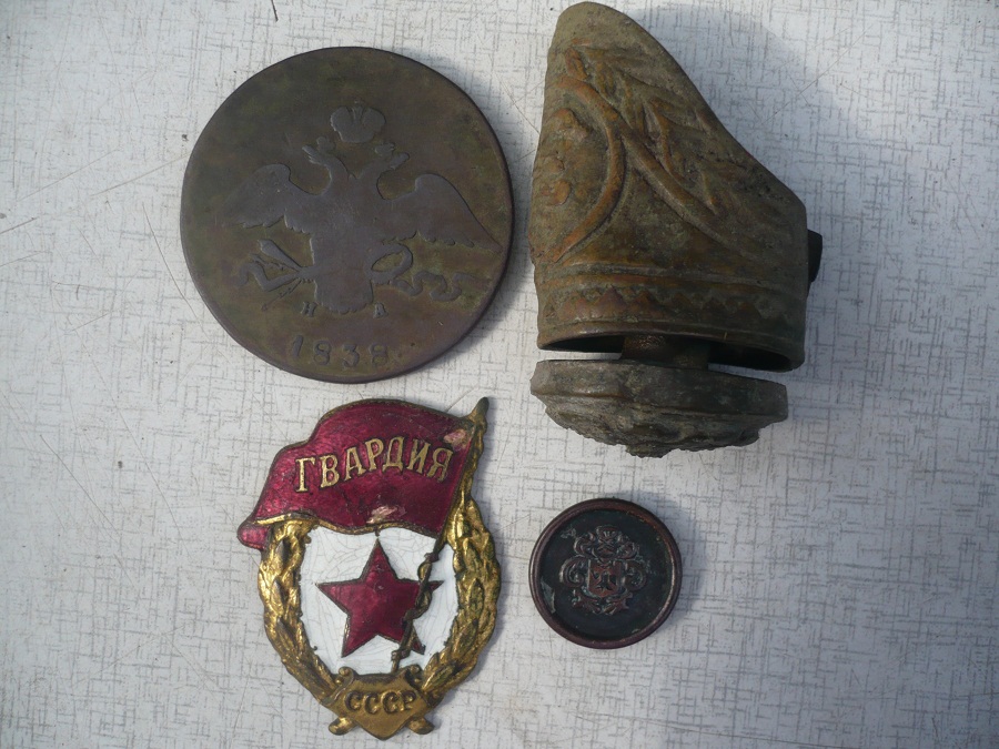 Привет ребята!Только что приехал с копа.Из находок:ГВАРДИЯ,не понятная пуговичка,деталь рукояти от холодного оружия,жаль что вмята с одной стороны и очень долгожданная и желанная монета 10 копеек масон.Затёртый десюн,но сколько было радости,сколько было эмоций.