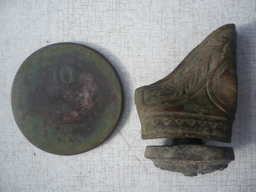 QUOTE(Slavjanin @ Aug 4 2012, 17:30) Привет ребята!Только что приехал с копа.Из находок:ГВАРДИЯ,не понятная пуговичка,деталь рукояти от холодного оружия,жаль что вмята с одной стороны и очень долгожданная и желанная монета 10 копеек масон.Затёртый десюн,но сколько было радости,сколько было эмоций. У "массонов" рельеф низкий,в сохране редко попадаются,а от холодняка-это верхняя втулка и гайка от офицерской драгунской шашки,вензель не видно,Николай||? |