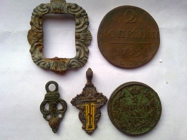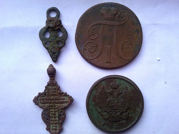 Вчерашний выезд в поля. Крестик, украшение, деньга(перечекан) и две двухи- Павла и А-1. Недельку назад в огороде поднял залипуху из четырех монет - две деньги и пара 2 копеечных монет Е-2 и Елизаветы. На Елизавете(перечекан) гурт с надписью Екатеринбургского мон. двора.Подскажите по украшению - что это?