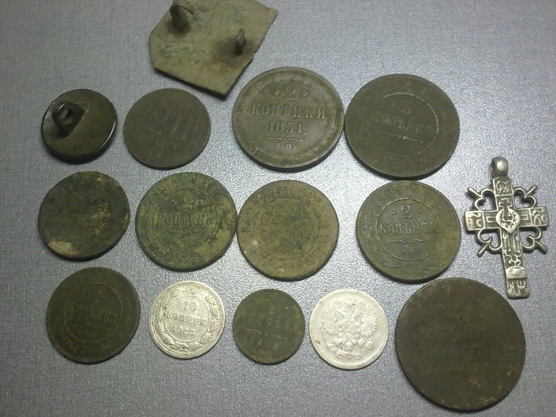 вообщем решил поделиться своим первым ' кладом' монет времен ссср))помчали в 3 на месть копа но ожидал нас 'оьломчик маленький'покопали все)))вообщем не долго думая переселились в поле где рядом пляжик))и оп с 1 ямки 9 монет ссср разного наминала)у второго друга мобилка дешовенькая и часы))у 3 кольцо'спаси и сохрани'серебреное и крестик серебреный))))вот так коп по старине плавно переходит в пляжно-подводныы)))