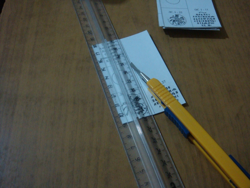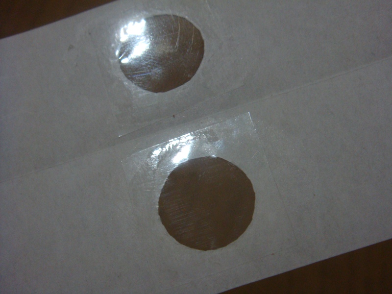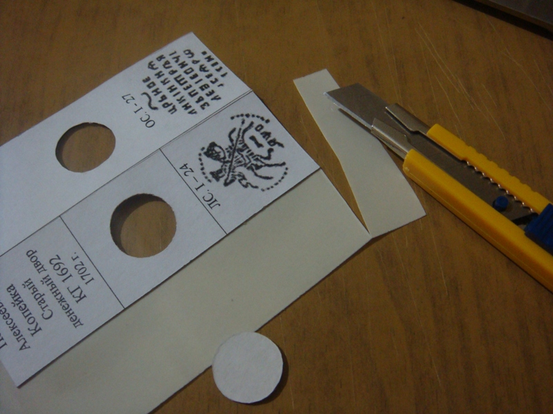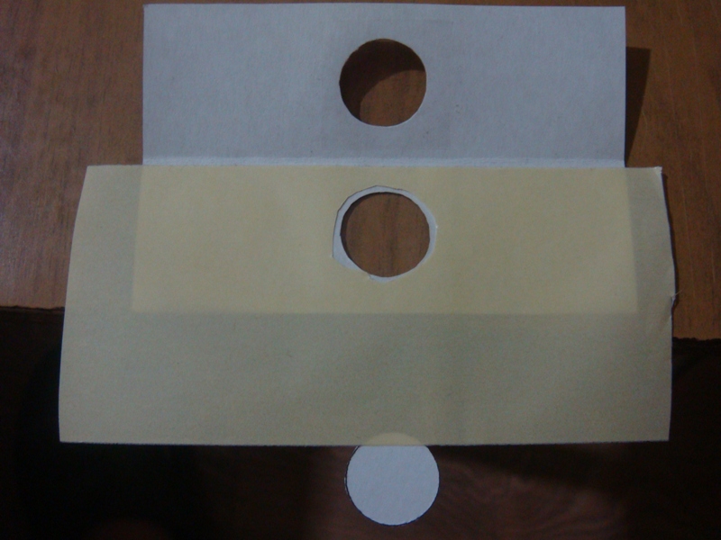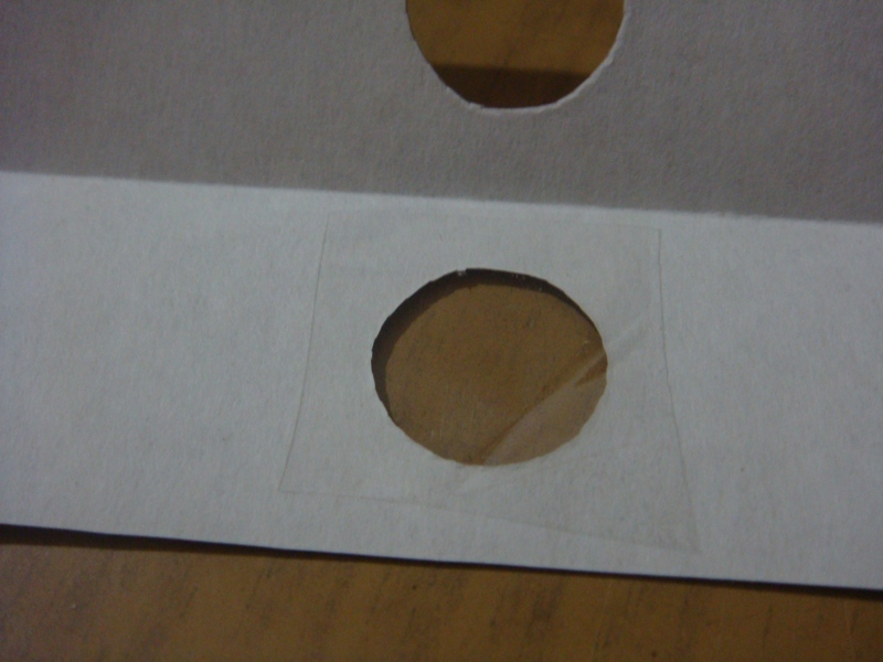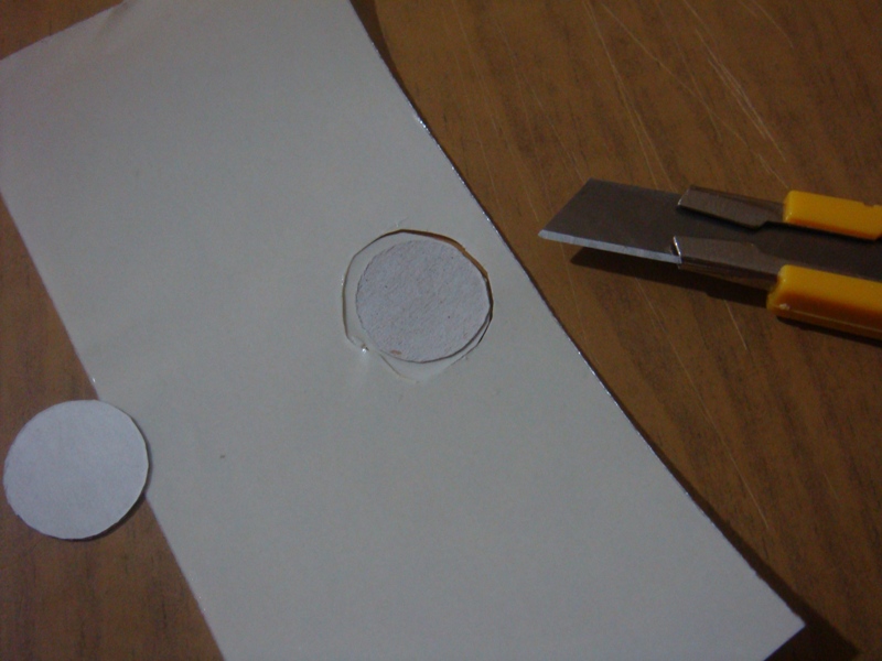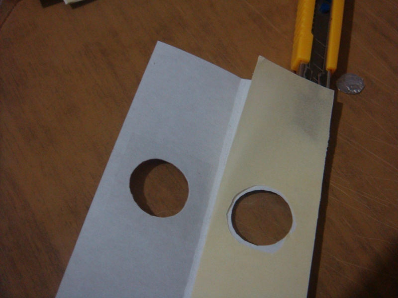 затем, берем двусторонний скоч, на клеющую сторону приклеиваем кружок, вырезанный из окошка и ножом вырезаем по его контуру отверстие с небольшим припуском (1-2 мм) и наклеиваем его на одну из внутренних сторон холдера