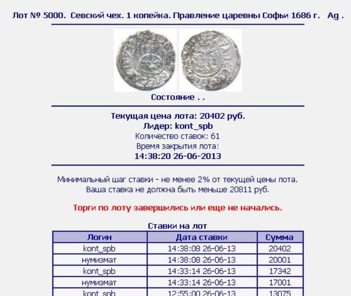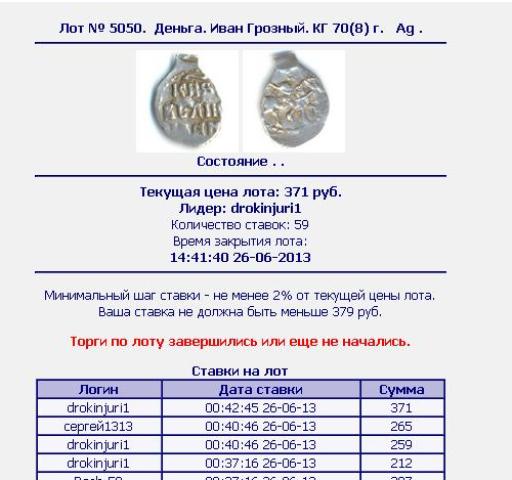 QUOTE(Пиротехник @ Jun 28 2013, 12:43) Юрий, на такие проходы лучше не ровняться, обычно ботами разгоняют, обратите внимание на время ставок- секунда в секунду! Там секунда в секунду получается из-за заочных битов. Т.е. делаешь ставку на определенную сумму, а система не показывает твоей ставки, только автоматически добавляет по 2 процента от текущей ставки, пока кто-то не поставит больше... Как на Молотке. -------------------- Продажа бон мира и средневековых монет по фиксу (Орда, чешуя и др.) - смотреть в моих темах.