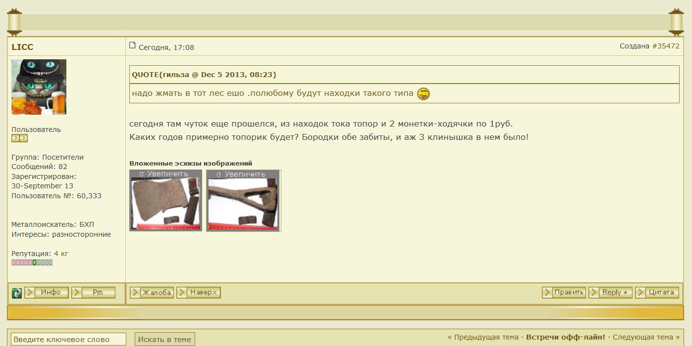 Бывалый ![]() ![]() ![]() Группа: Забанены Сообщений: 187 Зарегистрирован: 14-June 10 Из: RUS 31 Пользователь №: 18,952 Металлоискатель: Minelab X-Terra 705 Репутация: 40 кг |