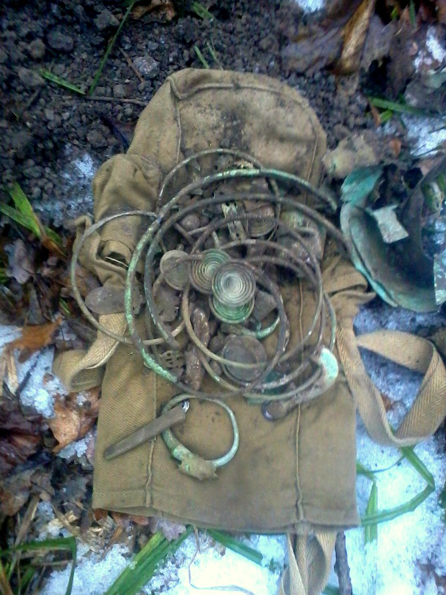 QUOTE(М.А.М.-сибиряк @ Dec 30 2013, 23:26) А теперь у меня просто нет слов, вижу глубину залегания находки, а самое главное что клад, я так понял был поднят в лесу. В этом сезоне, тоже хожу практически только по лесам(90%) Глубина не сильно больше полтора штыка фискаря до верхней точки. Сигнал был сильно прыгающий в цветном диапазоне и все это в десятке метрах от окопов. Когда копнул на штык и расширил ямку сигнал таким же и остался. Хотел бросить (уже почти ушел) думал, что то типа железное, которое бросает в цвет, (первая мысль что снаряд или, на моем приборе такое часто бывает когда попадаются круглые железяки типа консервных крышек, колец из железа, звеньев цепей..). Потом думаю ну еще чуток подкопну... и тут вылезли те что на фото тонкие полоски все в зеленке. Я сначала подумал, что цинк от патронов. Ну и лопатой его, лопатой... А оттуда как начали вылетать кольца и браслеты... |