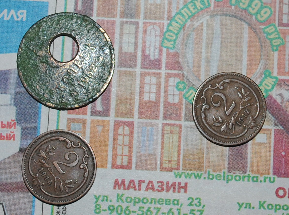 А я вот в воскресенье случайно немного копнул в Долбино, и выкопал прикольные две монетки, думаю Немецкие или Прусские и пятак замучанный (даже не отмывается)